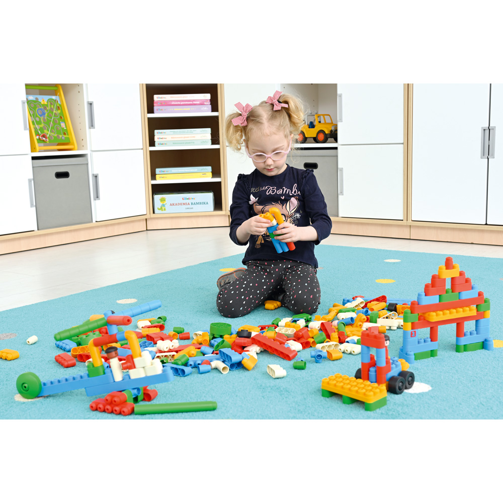 Unendliche Spielfreude wird mit diesem farbenfrohen Set garantiert. Mit den abgerundeten Bausteinen entstehen Türme, die in den Himmel wachsen, Bauwerke, Fantasiefahrzeuge oder Bäume. Kleine Baumeister können kreativ sein.