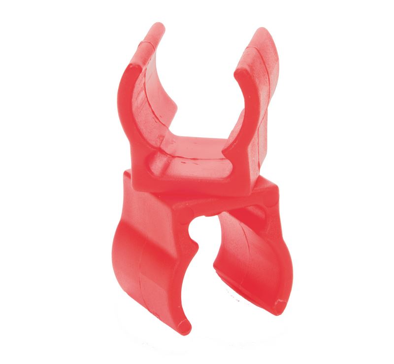 Der rote Clip verfügt über eine drehbare Mittelachse und dient zum Verbund mehrerer Rundstäbe.