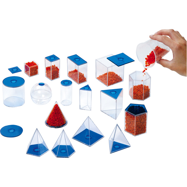 17 transparente Volumenkörper helfen, geometrische Formen kennenzulernen. Sie eignen sich ideal zur Erklärung geometrischer Grundbegriffe wie Kante, Seite, Ecke, Grundfläche, etc. Der Boden ist abnehmbar, so kann die Zuordnung von Grundfläche zum Körper geübt werden. Ausserdem können die Formen so mit Sand, Wasser und kleinen Kugeln gefüllt werden.