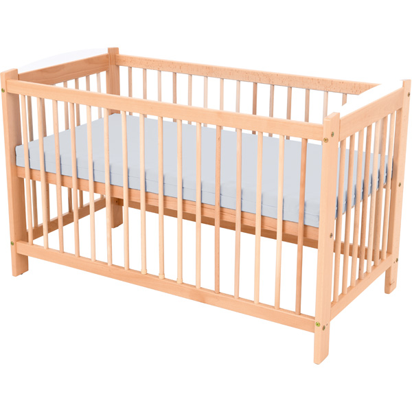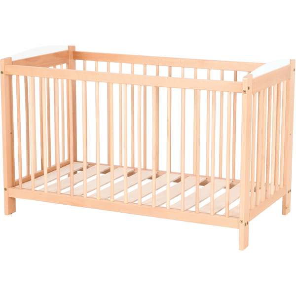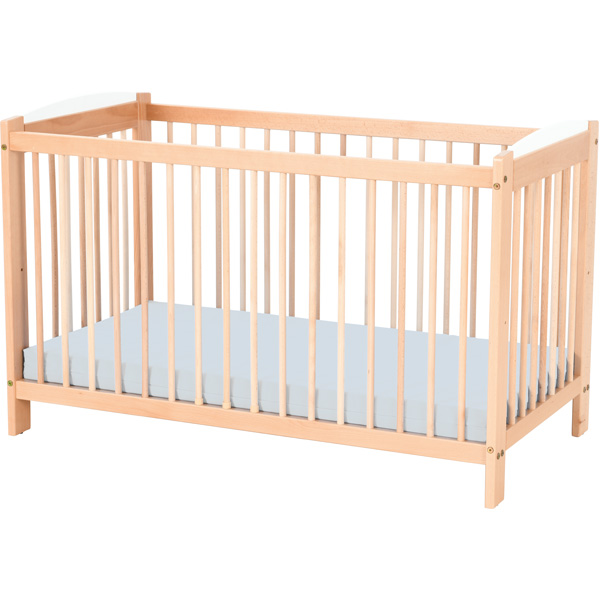 Baby-Bett aus lackiertem Buchenholz. Die Matratze (101822) ist separat zu bestellen. Zum Bettchen werden zusätzlich Rollen angeboten (118260; separat zu bestellen), die den Transport erleichtern.