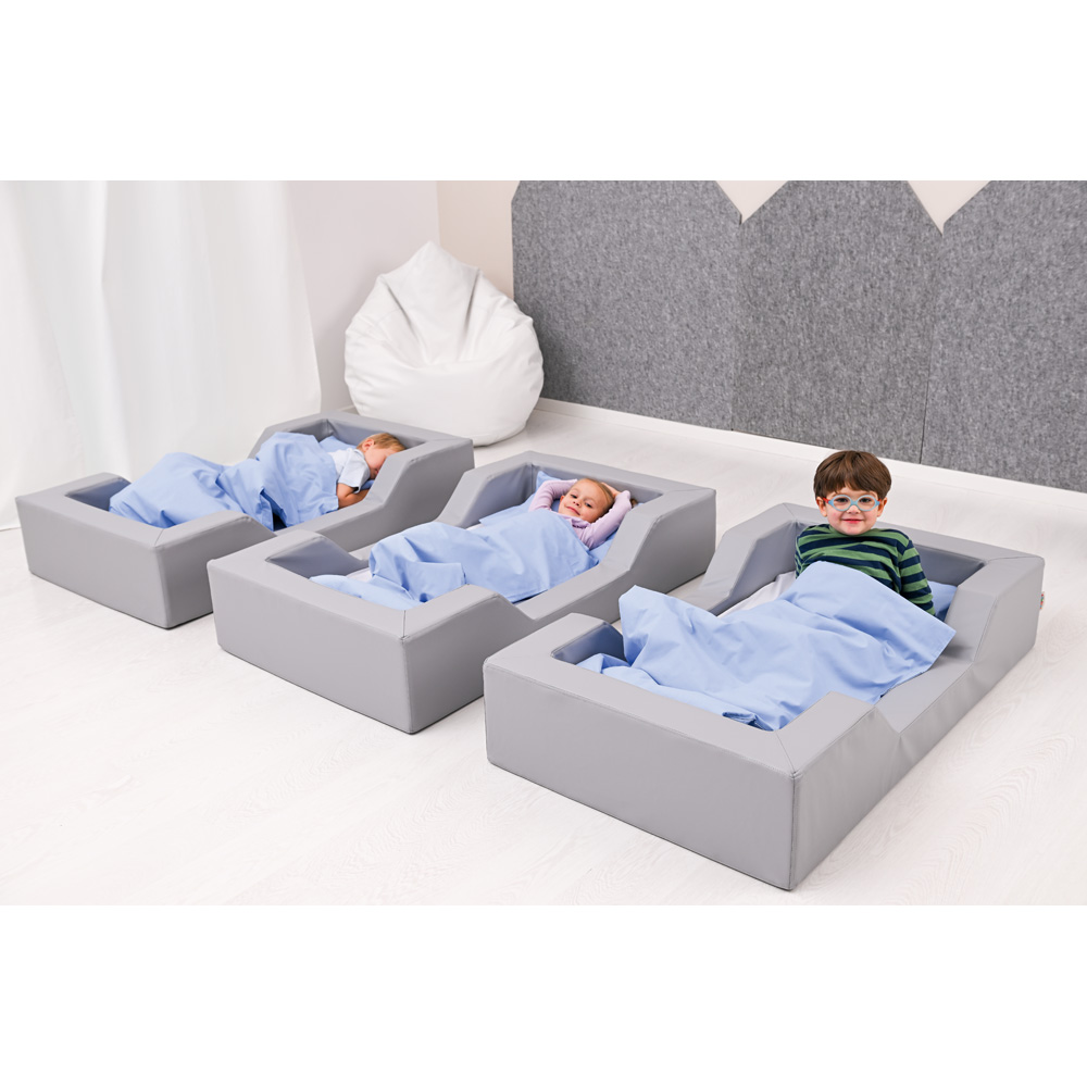Stapelbare Betten aus strapazierfähigem Schaumstoff mit pflegeleichtem Kunstlederbezug; inklusive Matratze. Damit die Kinder ganz einfach in das Bett ein- und aussteigen können, ist hier eine praktische Öffnung integriert.