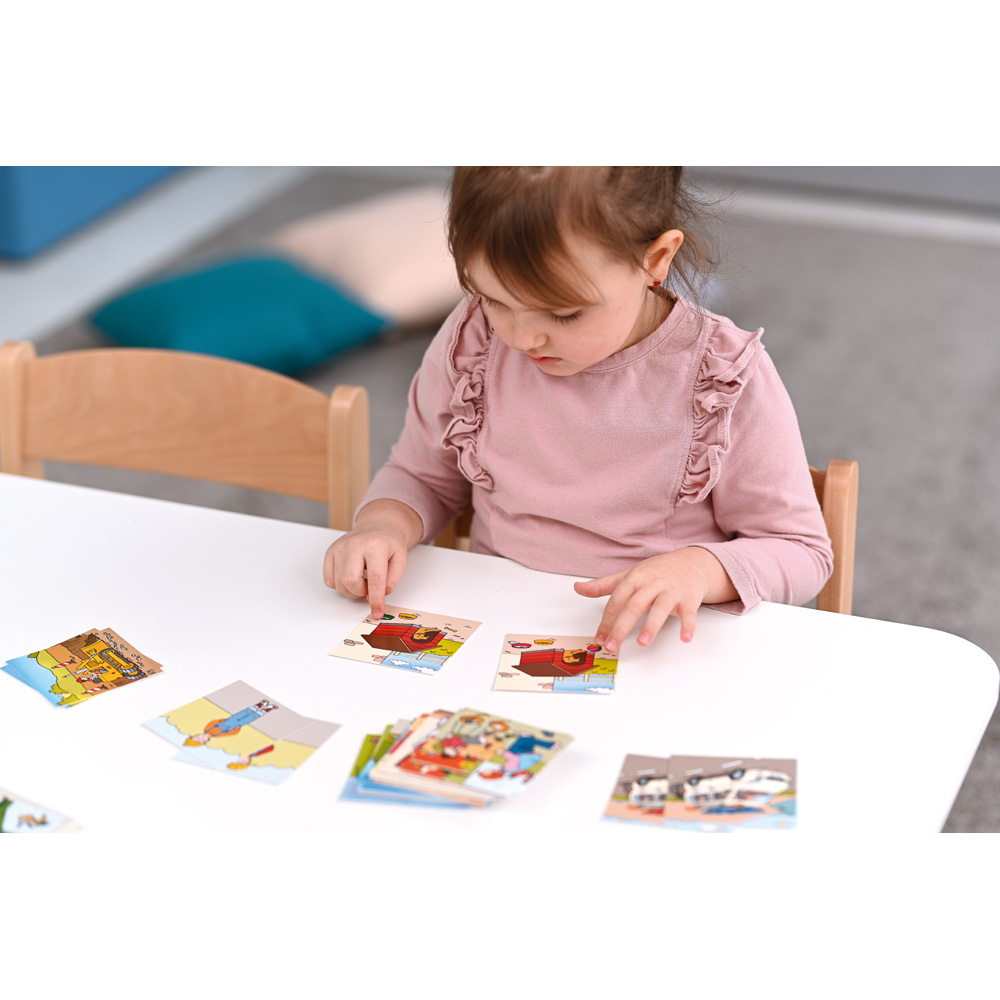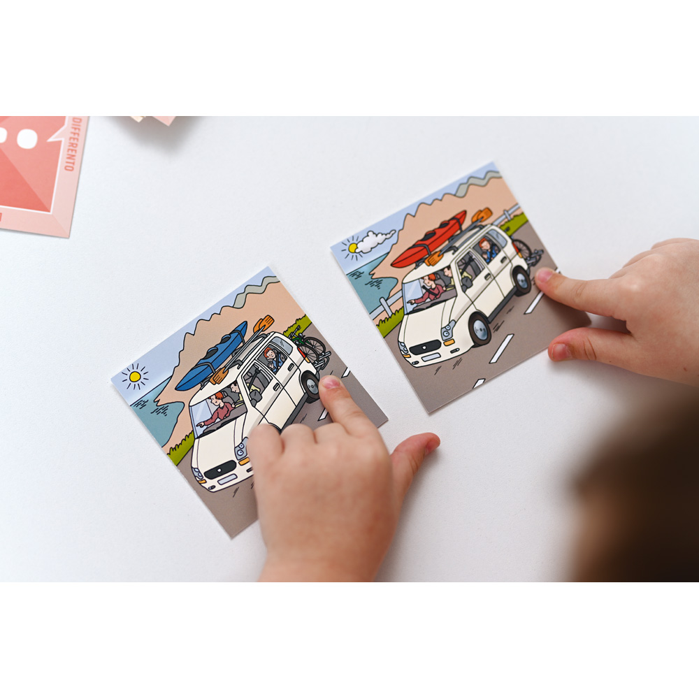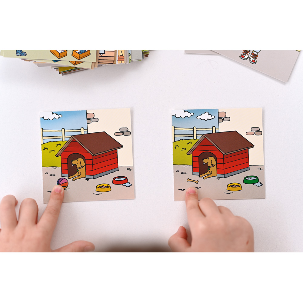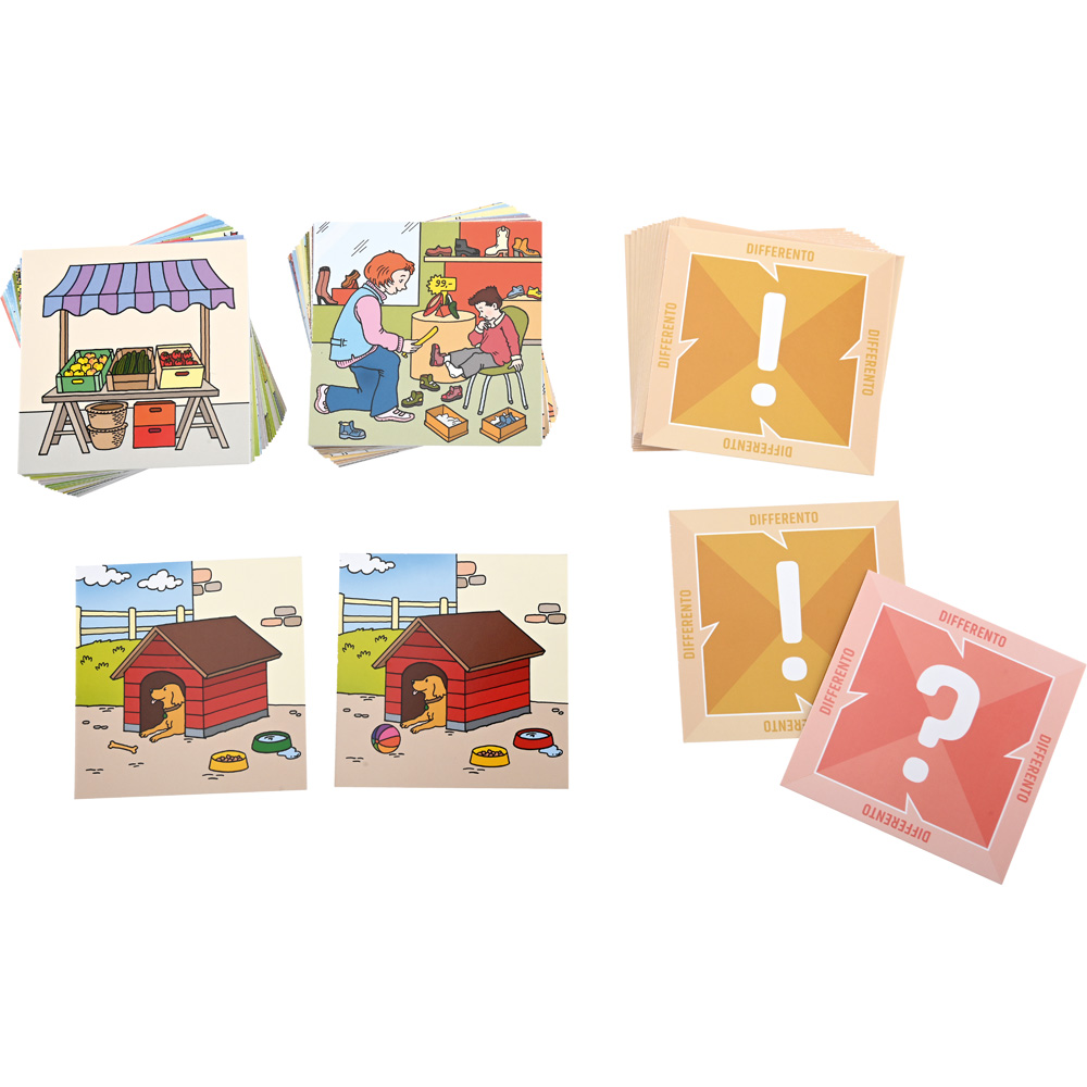 Die Spieler sollen die Unterschiede in zwei Bildern finden. Allerdings sehen sie dabei nur ihre eigene Karte und müssen die Details des Kartenpaares durch gezielte Fragen herausfinden. Doch auch einzelne Kinder haben ihren Spass, wenn sie während des Spiels eine mündliche oder schriftliche Aufgabe bewältigen. Fördert die Beobachtungsgabe und das Hörverstehen, räumliche Orientierung sowie Gedächtnis und Konzentration. Auch sprachliche Fähigkeiten werden trainiert.