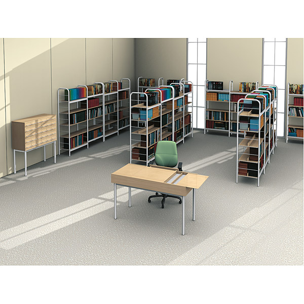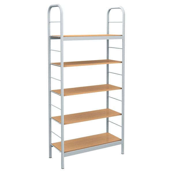 Bücherregal mit Metallrahmen (32 mm Rundrohr); mit 5 laminierten Böden (Buche-Optik), diese werden in den Metallrahmen eingehängt. Das Regal kann frei im Raum aufgestellt werden. Fachhöhe ca. 30 cm.