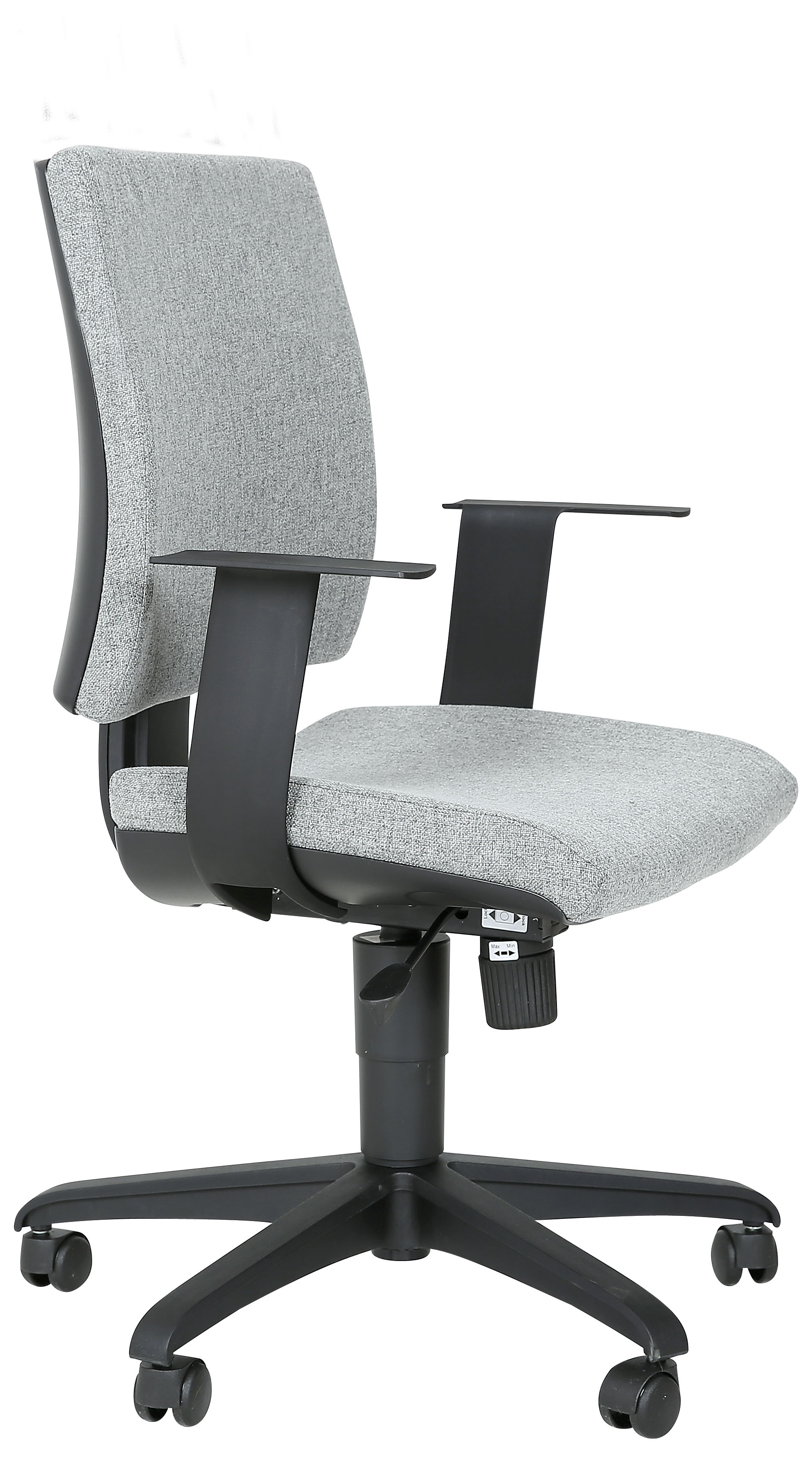 Moderner Bürostuhl mit Höhenverstellung, grosszügigem komfortablem Sitz und ergonomisch geformter Rückenlehne; vollgepolstert. Sitz- und Rückenlehne sind stufenlos neigbar, lassen sich in 5 Positionen arretieren. Die Anti-Schock-Funktion verhindert, dass die Rückenlehne nach Lösung der Arretierung gegen den Rücken des Nutzers schlägt. Armlehnen aus Kunststoff. Die Bürostuhlrollen sind lastabhängig gebremst. Der Stuhl rollt also nur, wenn jemand darauf sitzt.