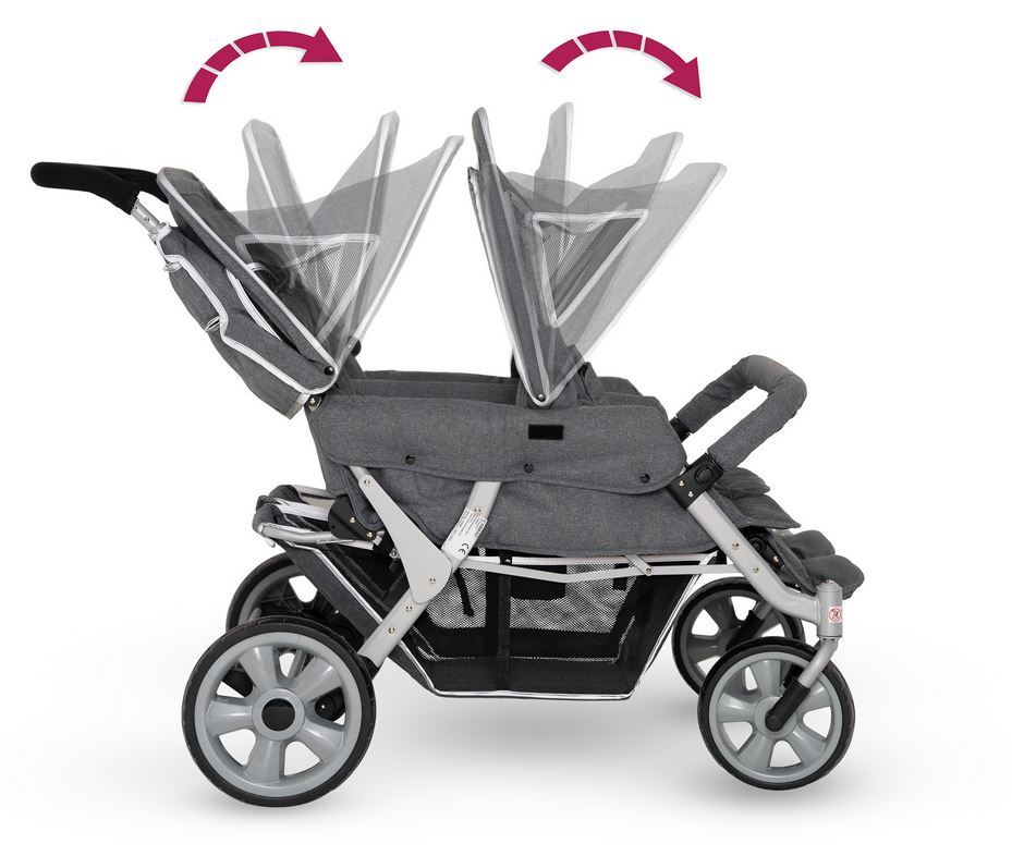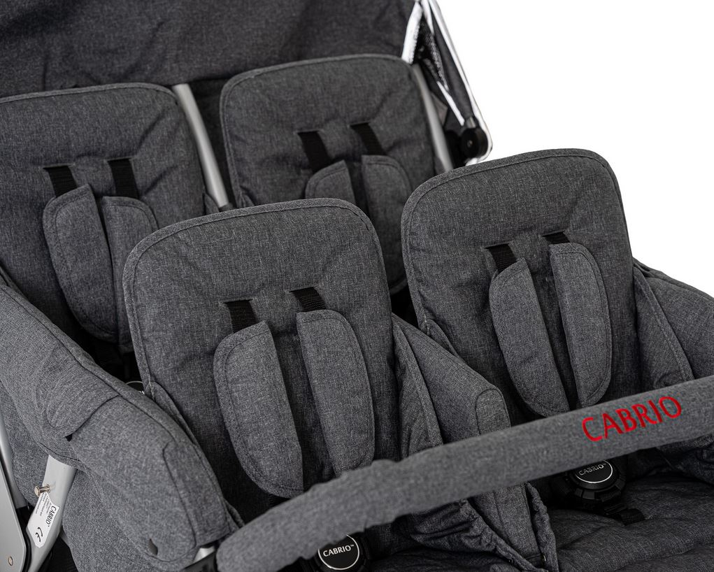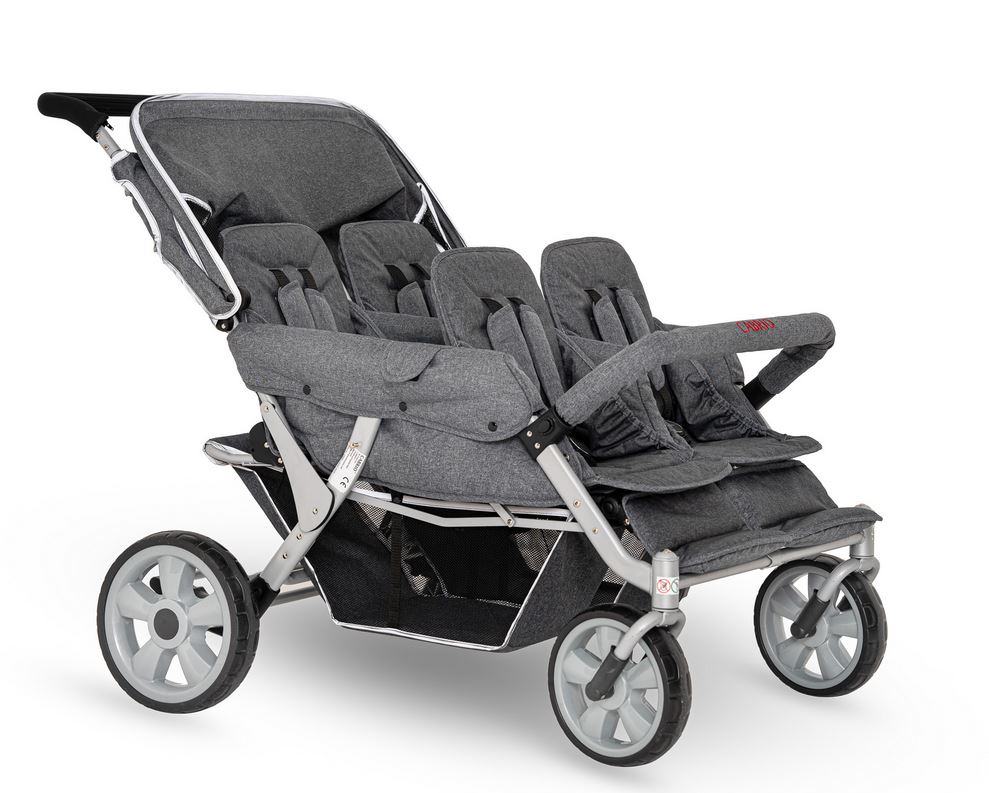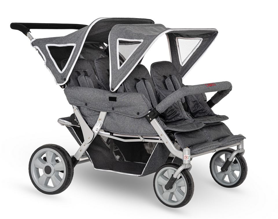 Der leichte CABRIO™ Kinderwagen wurde speziell für Kindergärten und Pflegefachkräfte entwickelt. Rückenlehnen und Fussstützen der mit Sicherheitsgurten ausgestatteten Sitzplätze können individuell eingestellt werden. Der grosse Gepäckkorb bietet viel Platz für grosses Proviant, Lieblingspuppen oder Strickjacken. Den nötigen Schatten und Schutz vor UV-Strahlen spenden zwei abnehmbare Sonnendächer. Die sind übrigens, ebenso wie der Gepäckkorb, mit Reflektorstreifen versehen. Die leicht bedienbare Fussbremse sorgt für eine zusätzliche Sicherheit. Trotz seiner stabilen und kompakten Bauweise lässt sich der „Cabrio Buggy“ angenehm leicht manövrieren.