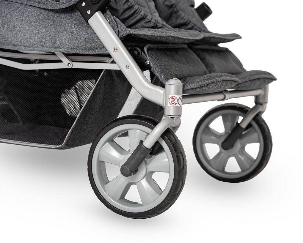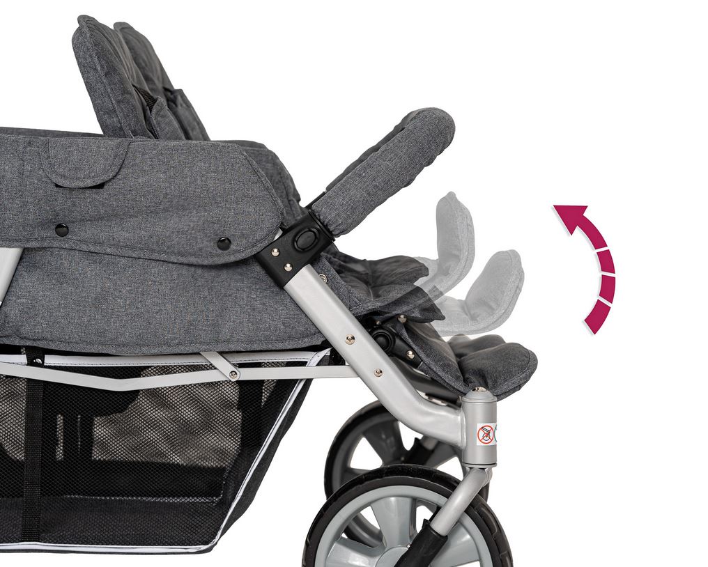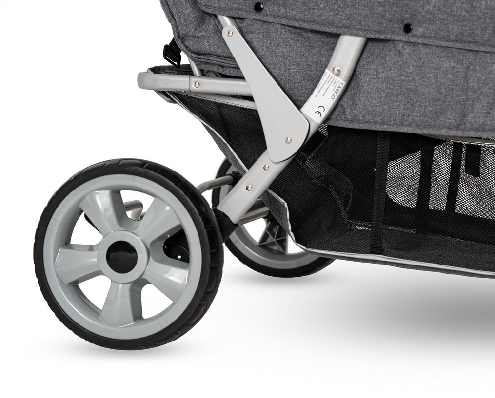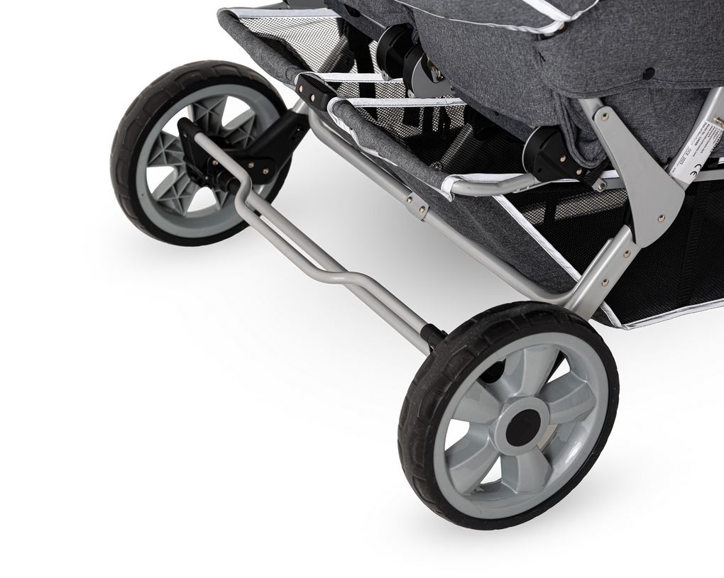 Der leichte CABRIO™ Kinderwagen wurde speziell für Kindergärten und Pflegefachkräfte entwickelt. Rückenlehnen und Fussstützen der mit Sicherheitsgurten ausgestatteten Sitzplätze können individuell eingestellt werden. Der grosse Gepäckkorb bietet viel Platz für grosses Proviant, Lieblingspuppen oder Strickjacken. Den nötigen Schatten und Schutz vor UV-Strahlen spenden zwei abnehmbare Sonnendächer. Die sind übrigens, ebenso wie der Gepäckkorb, mit Reflektorstreifen versehen. Die leicht bedienbare Fussbremse sorgt für eine zusätzliche Sicherheit. Trotz seiner stabilen und kompakten Bauweise lässt sich der „Cabrio Buggy“ angenehm leicht manövrieren.