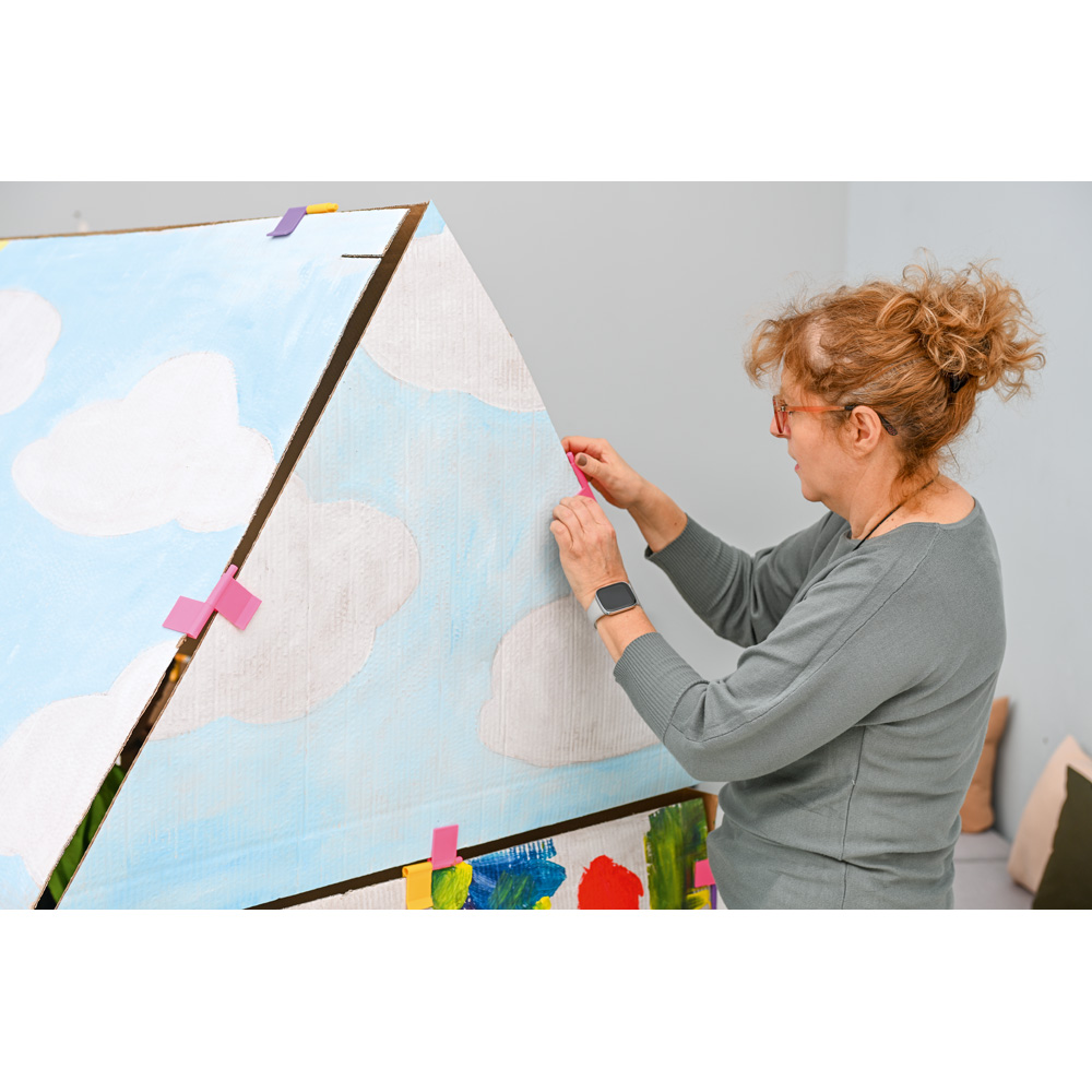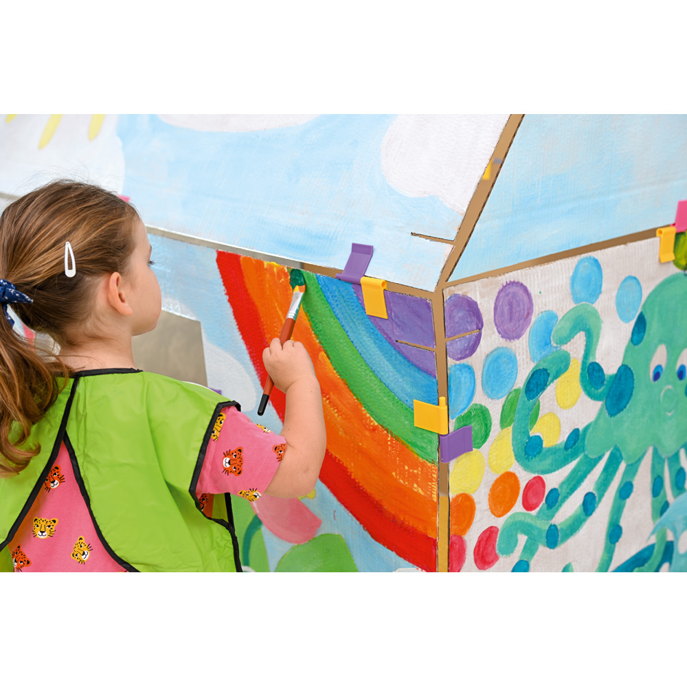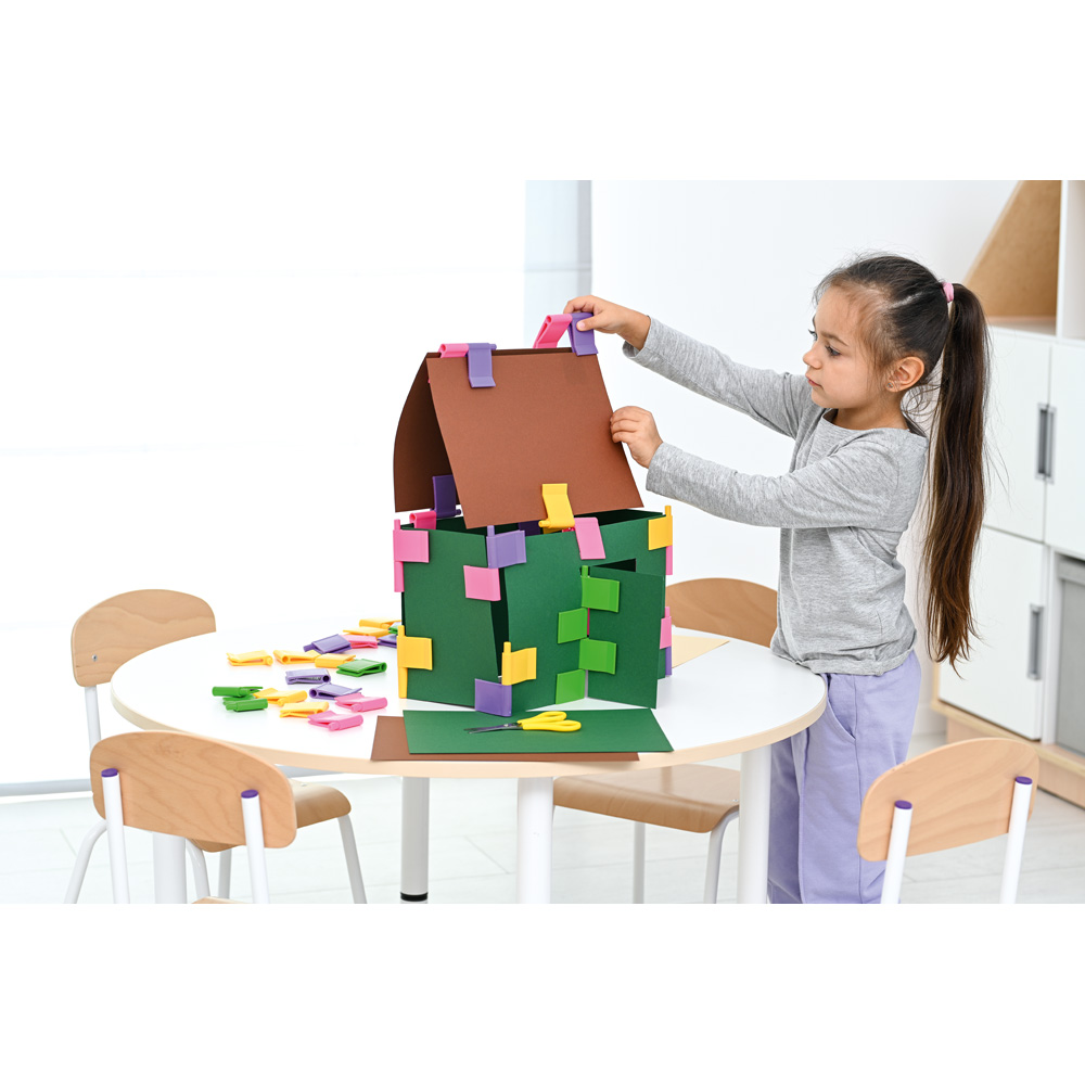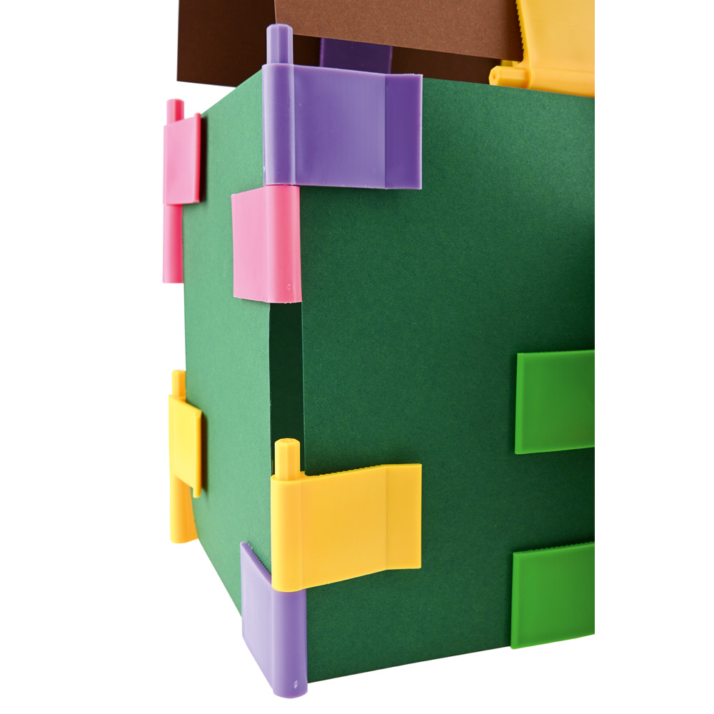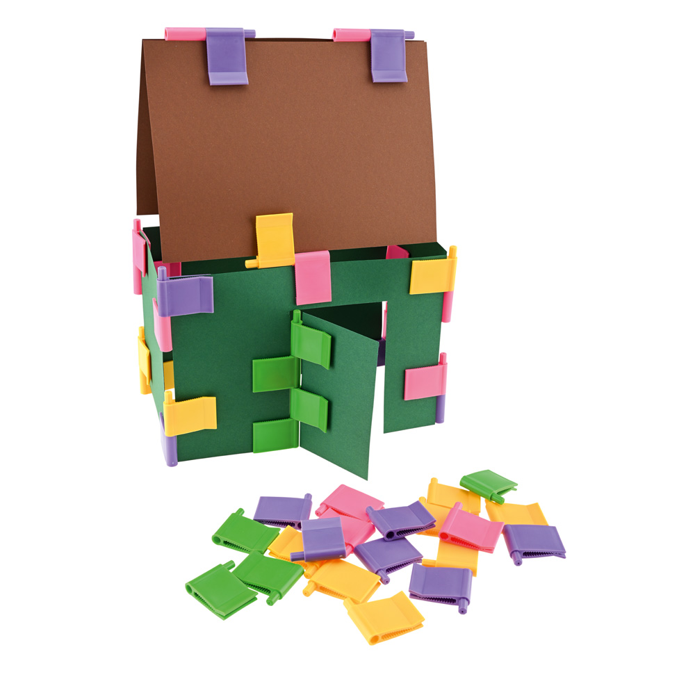 Mit diesen Clips werden Kartonbögen beweglich und zugleich fest miteinander verbunden, wenn z.B. Häuschen gebaut werden. Die achteckigen Stifte ermöglichen es, die Clips in festen Winkeln zu verbinden. Die grünen Clips haben runde Stifte und können für bewegliche Türen und Fenster benutzt werden.