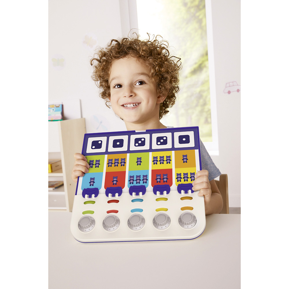 Ein neuartiges Kodierspiel, bei dem die Kinder Farbcodes erstellen bzw. erkennen müssen und sich durch den einzigartigen Mechanismus ganz einfach selbst kontrollieren können. So funktioniert's: In das Spielbrett wird eine Aufgabenkarte eingesteckt, die ganz oben eine Symbolfolge (z.B. Zahlen oder Buchstaben) enthält. In den Zeilen darunter müssen die Symbole wiedergefunden und an den Drehknöpfen unten die richtige Farbe eingestellt werden. Das Ergebnis kann immer wieder korrigiert werden. Nun wird das Geheimnis gelüftet und mit der richtigen Lösung unter den Klappen verglichen.