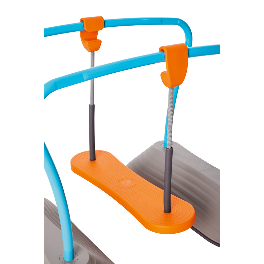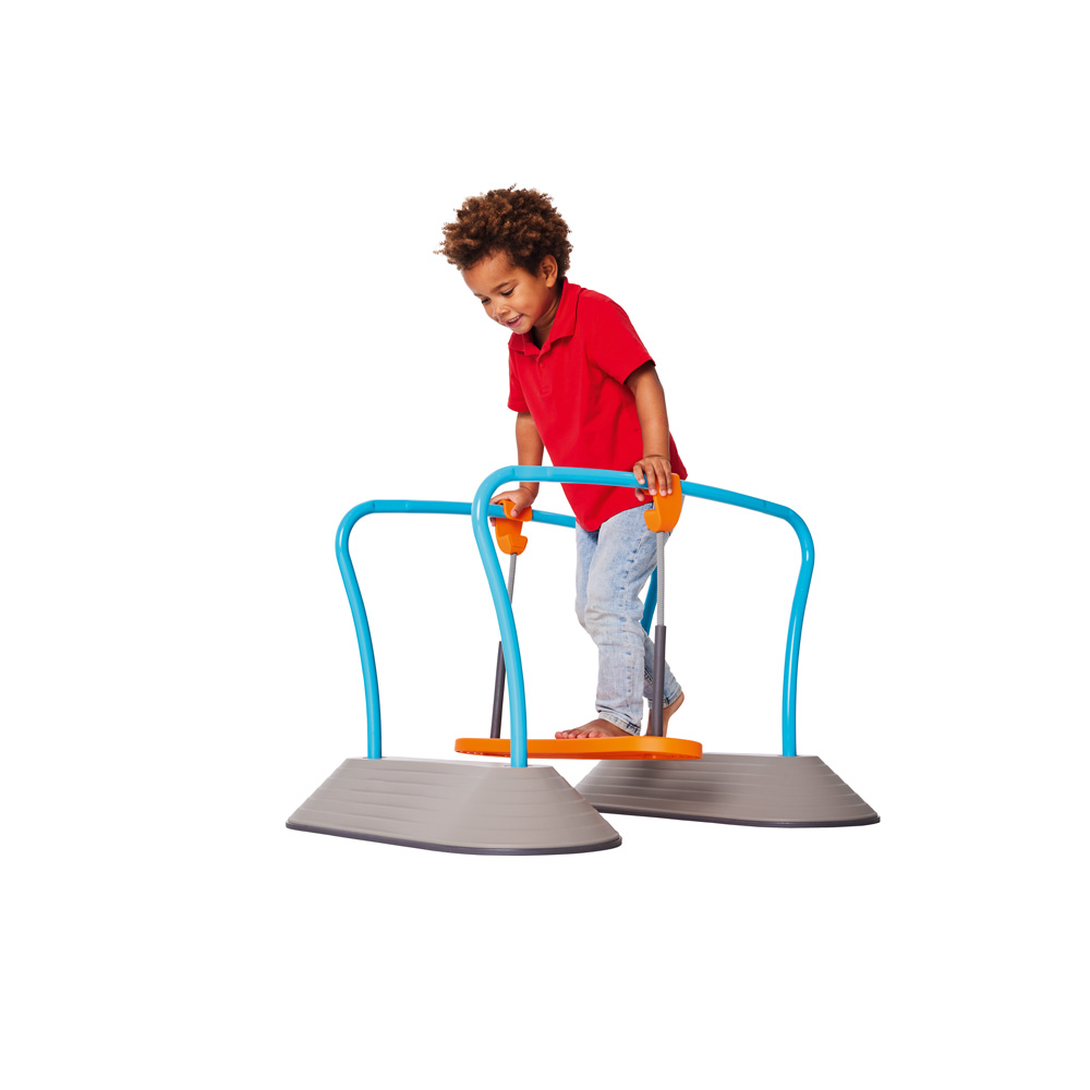 Der Hängende Steg besteht aus einem stabilen Balken, der an zwei starken Seilen aufgehängt ist und an den Mini Parkour - Hürden Gerade befestigt werden kann. Der Steg bewegt sich, wenn man auf ihn tritt. Es erfordert Konzentration und fördert gleichzeitig das dynamische Gleichgewicht und die Muskelkraft. Die Kinder gewinnen an Selbstvertrauen, wenn sie lernen, diese weitere neue Fähigkeit zu beherrschen.