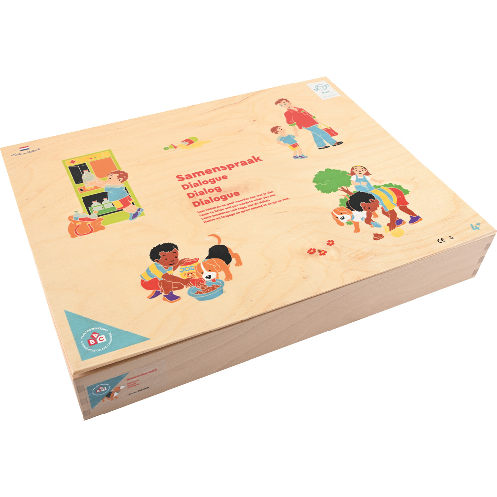 Dieses Spiel eignet sich zum selbstständigen Arbeiten, wenn es um das Erlernen der Sprache geht. Die auf den Tafeln dargestellten Themen greifen den Alltag der Kinder auf und regen sie zur Auseinandersetzung mit der dargestellten Situation an. Entwickelt die Kommunikationsfähigkeit, trainiert die Sprach- und Sprechfähigkeiten. Die Kinder lernen zuzuhören und das Gesehene in Worte zu fassen. Mit den gelochten Steckstiften können einzelne Darstellungen auf den gelochten Tafeln markiert werden. Spielen die Kinder zu zweit, wählt ein Kind ein kleines Bild und beschreibt es, das andere Kind markiert mit den Steckstiften auf dem grossen Bild, was es verstanden hat.