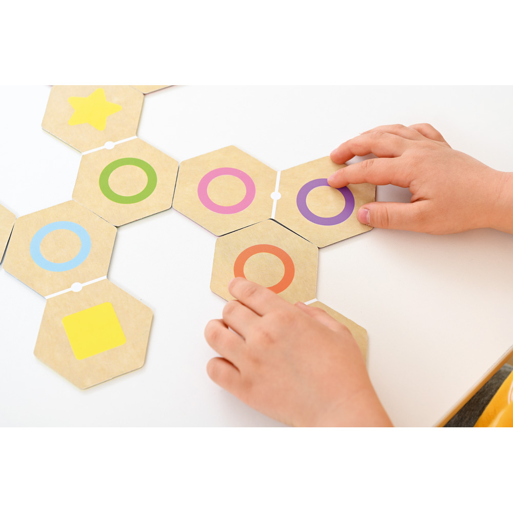 Die doppelseitig bedruckten Karten stellen eine farbige Form auf grauem Hintergrund oder eine weisse Form auf farbigem Hintergrund dar. Dadurch ergibt sich eine Vielzahl an Kombinationsmöglichkeiten: Legen nach Farben, Formen, beide Varianten gleichzeitig oder viele andere wie in der Anleitung beschrieben. Dies schult die selektive und konzentrierte Aufmerksamkeit der Kinder sowie den Beobachtungssinn. Wenn die Spieler entscheiden mehrere Runden zu spielen, bekommt der Gewinner jeder Runde einen Stern.