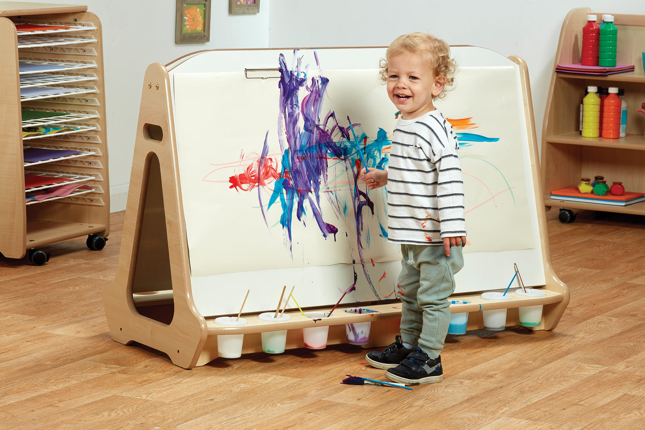 Die doppelseitige Staffelei mit 4 Malplätzen ist extra breit und perfekt für die Gestaltung eines Meisterwerks. Die Staffelei bietet viel Platz zum Malen - ideal für die Entwicklung von Armbewegungen und grobmotorischen Fähigkeiten.