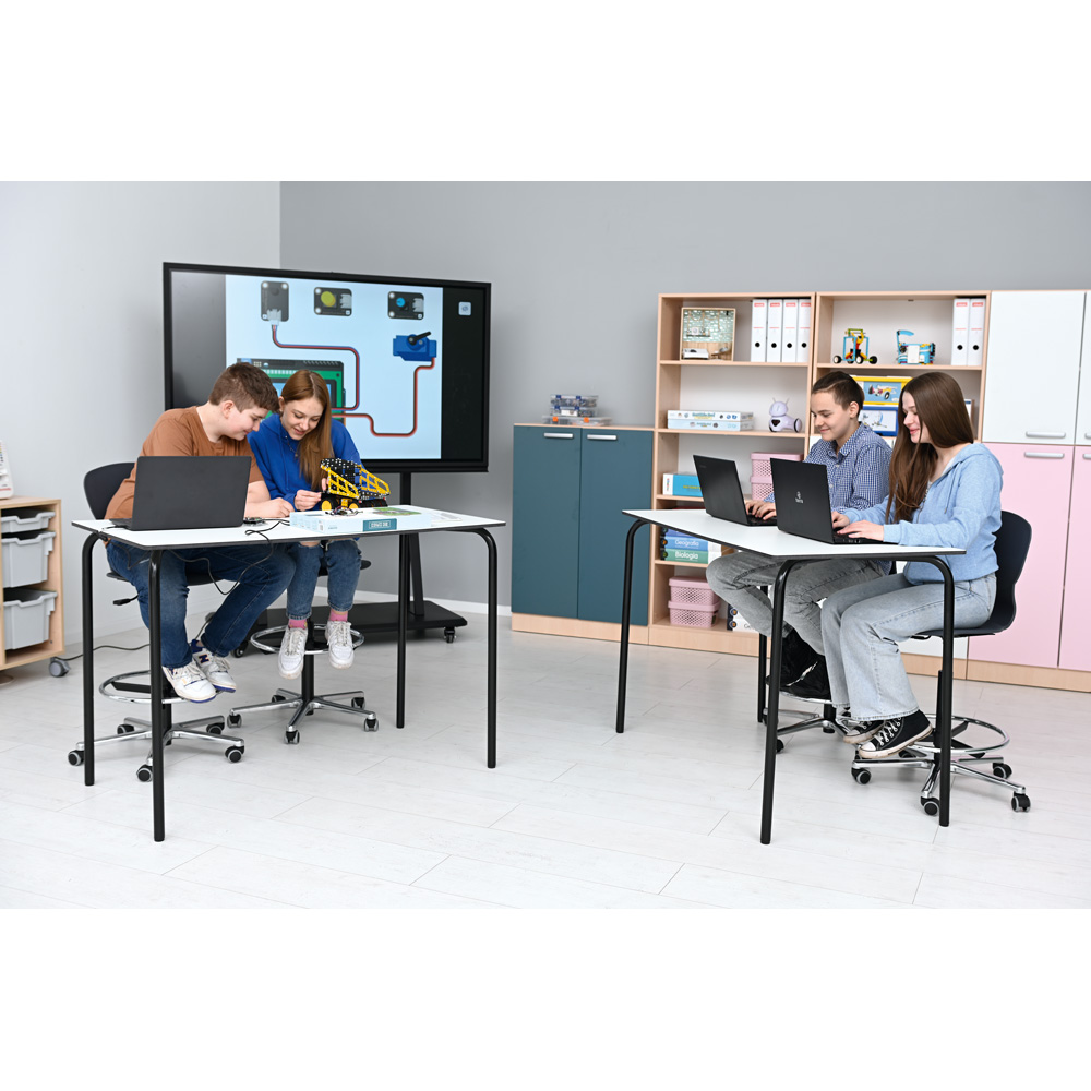 Der perfekte Stuhl fürs Experimentieren und Projektarbeit an höheren Arbeitstischen, um zwischen stehender und sitzender Tätigkeit zu wechseln. Für die richtige Körperhaltung beim Sitzen sollten die Füsse stets Bodenkontakt haben oder auf einer Fussstütze aufliegen. Diese kompensiert den Höhenunterschied und ermöglicht eine bequeme Sitzhaltung. Durch Höhenverstellung kann der Drehstuhl optimal an den Tisch angepasst werden. Rollen machen den Stuhl mobil. Die ergonomisch geformte Sitzschale aus Kunststoff ist robust und pflegeleicht, da kratzfest, schmutz- und wasserabweisend.