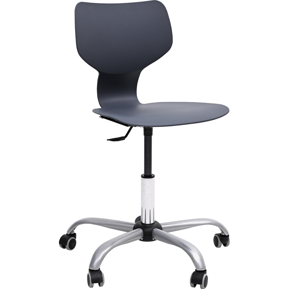 Modernes Design, Stabilität und Ergonomie in einem. Die frei federnde Rückenlehne aus Kunststoff passt sich dem Rücken an; rutschsichere, kratzresistente, schmutz- und wasserabweisende Oberfläche; alufarbenes Gestell aus Metall, 5 Rollen sorgen für die nötige Mobilität und Standsicherheit. Die Höhenverstellung ermöglicht eine optimale Anpassung an die Grösse des Kindes. Die Produktion erfolgt gemäss DIN-EN 1729.