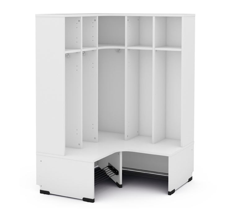 Hochwertige Kindergartengarderobe in hellem Ahorn-Dekor. Die Sitzbank erstreckt sich über die gesamte Schrankfläche und besitzt eine eingebaute Schuhablage mit Gitterrost. Passende farbige Türen mit leise schliessenden Scharnieren (gross 855533-855542 und klein 855523-855532) sind separat bestellbar. Vorbohrungen für Scharniere befinden sich rechtsseitig. Jedes Fach hat einen Doppelhaken für Bekleidung sowie Vorbohrungen für zusätzliche Dreifach-Haken (092530-092532, 255100-255102, separat bestellbar). Die Garderobe ist mit Kantenschutzfüssen mit Bodenausgleichschrauben ausgestattet. Hinten gibt es eine Aussparung für die Sockelleiste.