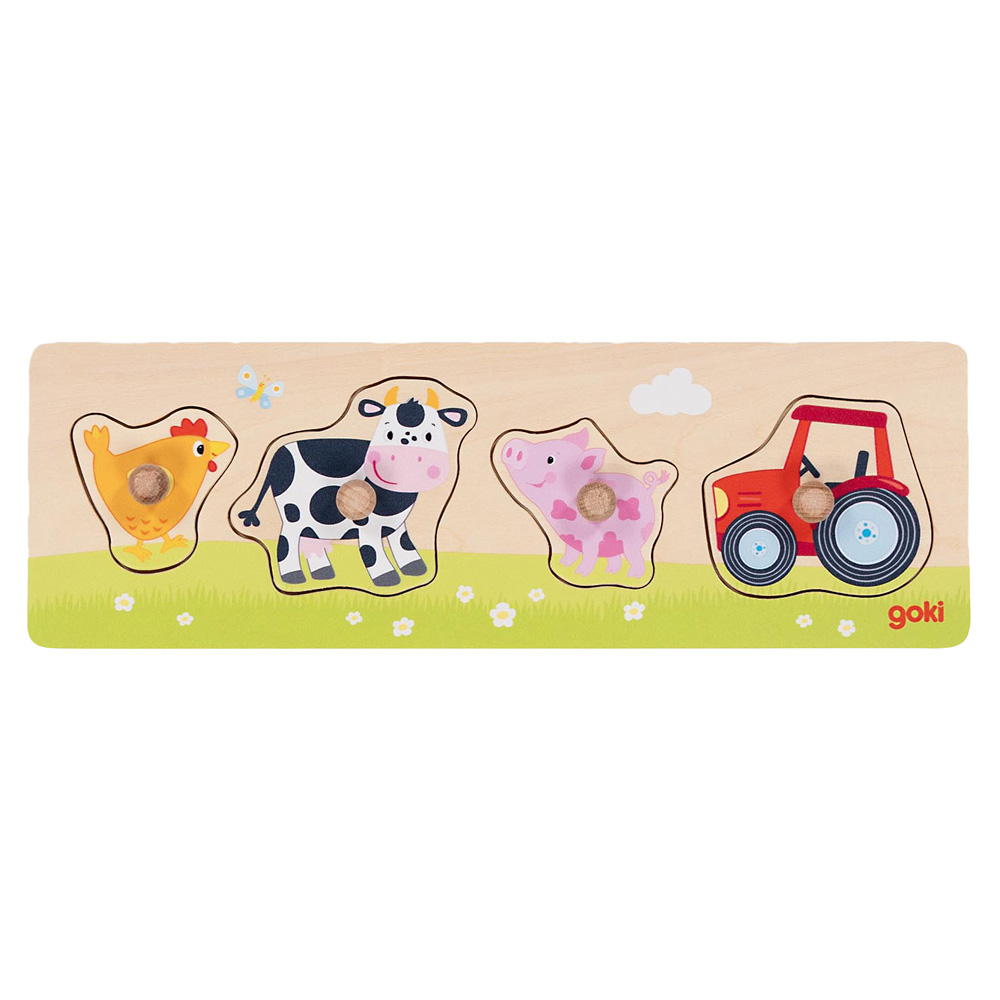 Ein Einlegepuzzle mit vier Teilen, die eine Henne, eine Kuh, ein Schwein und einen Traktor zeigen. Der extragrosse Holzgriff ist speziell für kleine Kinderhände konzipiert, so dass auch die Jüngsten die Teile problemlos greifen und halten können.