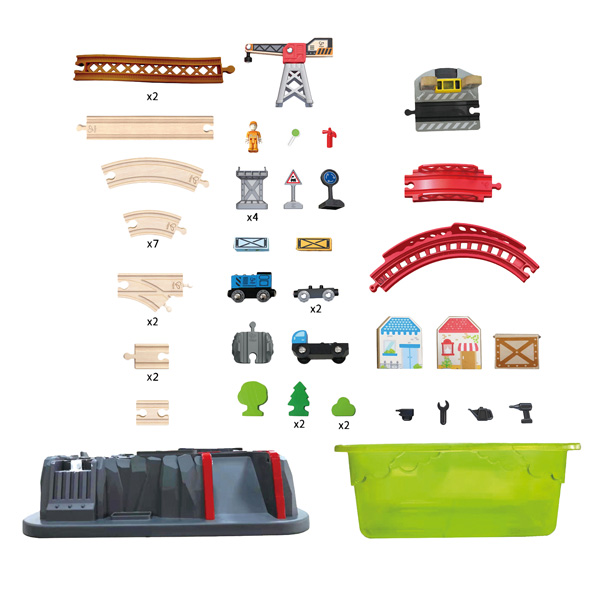 Baue deine eigene kleine Stadt. Alle Teile inklusive der Verpackung können zum Bauen genutzt werden. Im Set enthalten sind nicht nur die Schienen, sondern auch verschiedene Fahrzeuge und Figuren, die das Szenario zum Leben erwecken - u.a. Häuser, Bäume, Schilder, Lok und Waggons oder auch ein Kran.