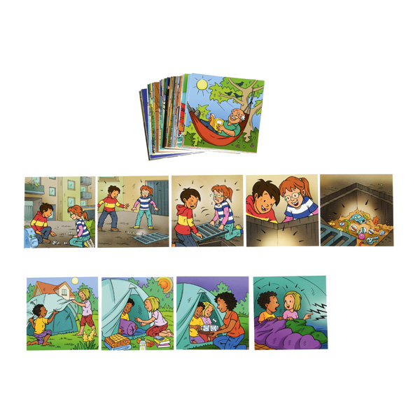 Die Kinder sollen die Karten in eine logische Reihenfolge bringen und die darauf abgebildete Geschichte erzählen. Die Bildergeschichten werden als Sprechanlass, für die Wortschatzerweiterung und das Sprachverständnis eingesetzt. Bei Schulanfängern können sie als Einstieg ins Schreiben erster Texte verwendet werden. Jede der einfachen, spannenden Bildsequenzen hat eine kleine Pointe.
