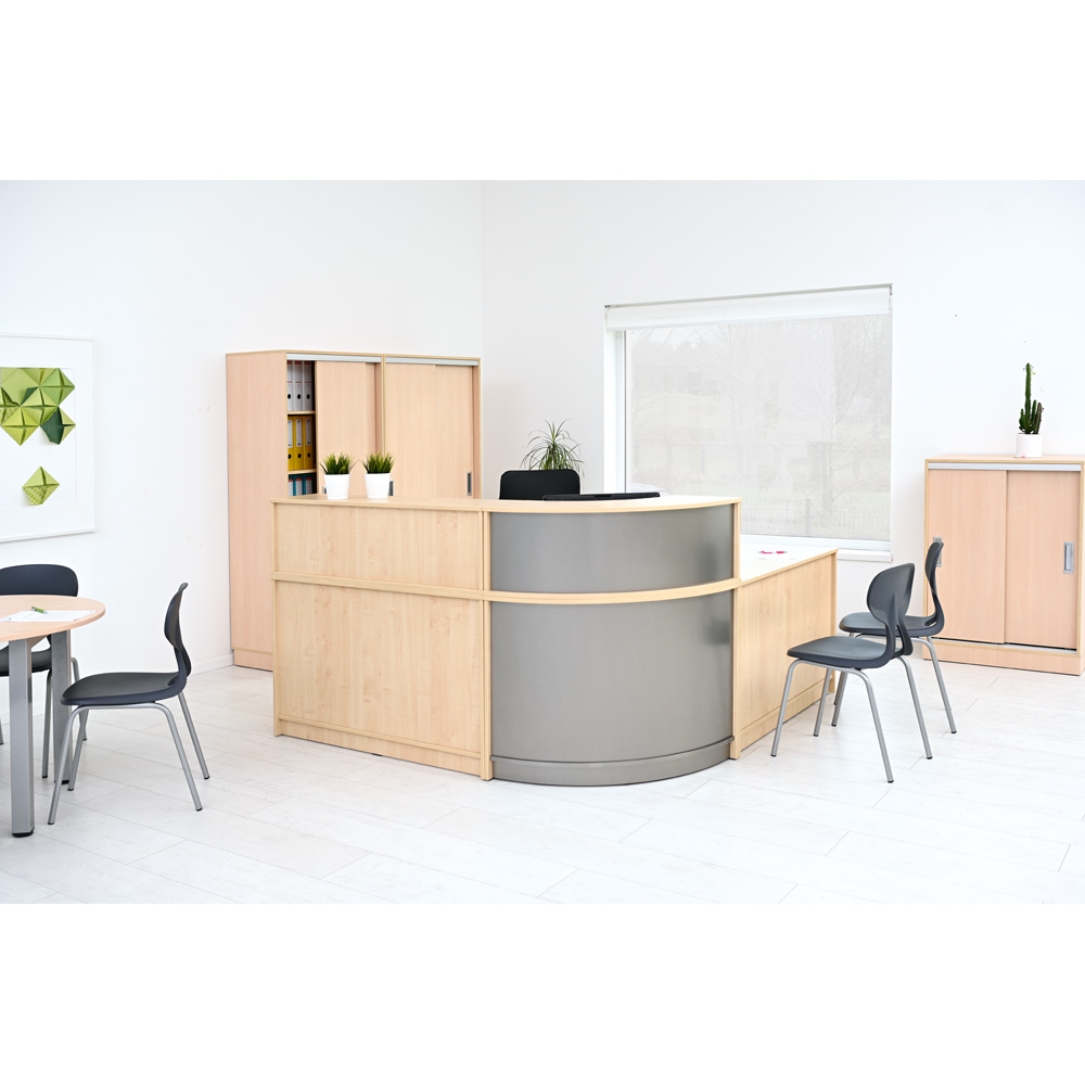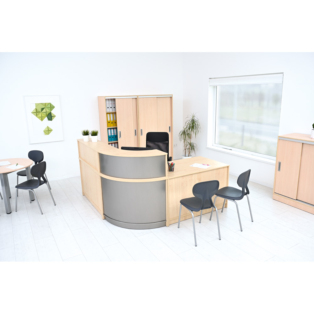 Die Empfangstheke bildet eine Grenze zwischen dem Besucherraum und dem Arbeitsplatz der Rezeptionistin. Es ist sehr wichtig, dass sie den Komfort der Mitarbeiter und einen einfachen Zugriff auf Geräte und Dokumente gewährleistet. Einzelne Teile sind beliebig kombinierbar zu einfachen Theken, Ecktheken, Theken mit Aufsätzen. Eckteile mit aluminiumfarben laminierten Fronten. Die Seitenwände der geraden Theken sind den Gegebenheiten angepasst: die an die Ecktheke grenzende Seitenwand ist verkürzt, sodass weiterhin ein Zugang unter die Ecktheke besteht.