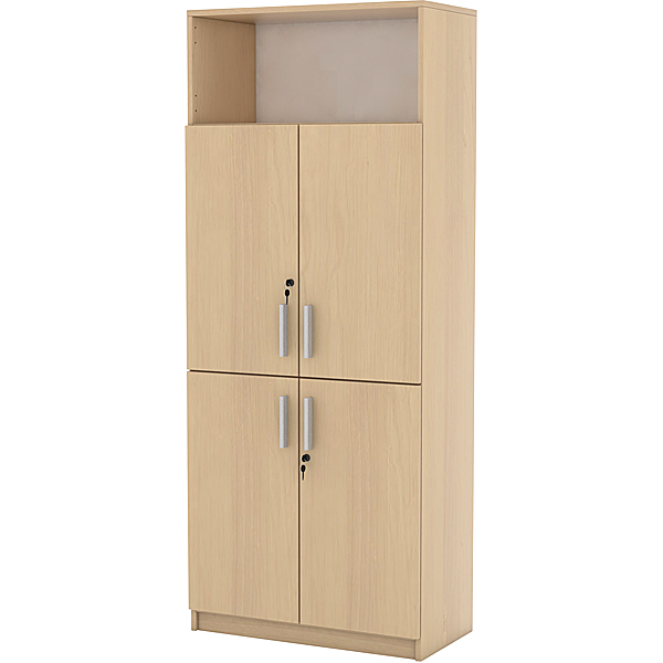 Schrank viertürig; aus laminierter Spanplatte (Stärke 18 mm); mit Sockel. Fachböden verstellbar.