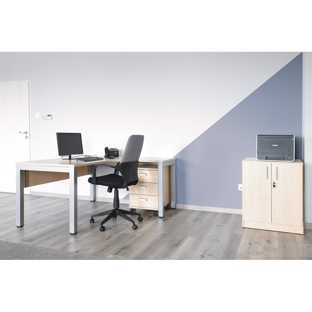 Unterschrank für Kopiergerät oder andere Bürotechnik; aus laminierter Spanplatte (Stärke 18 mm); mit Sockel. Fachboden durchgängig verstellbar.