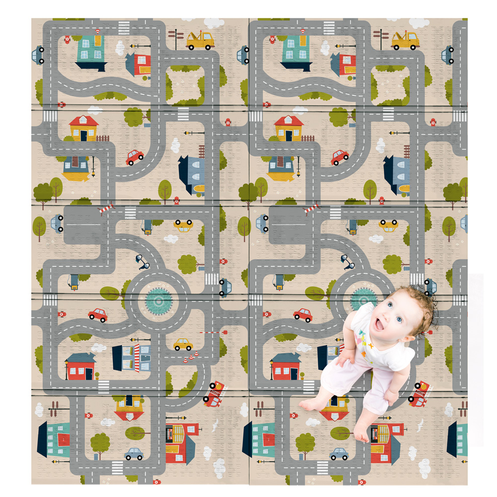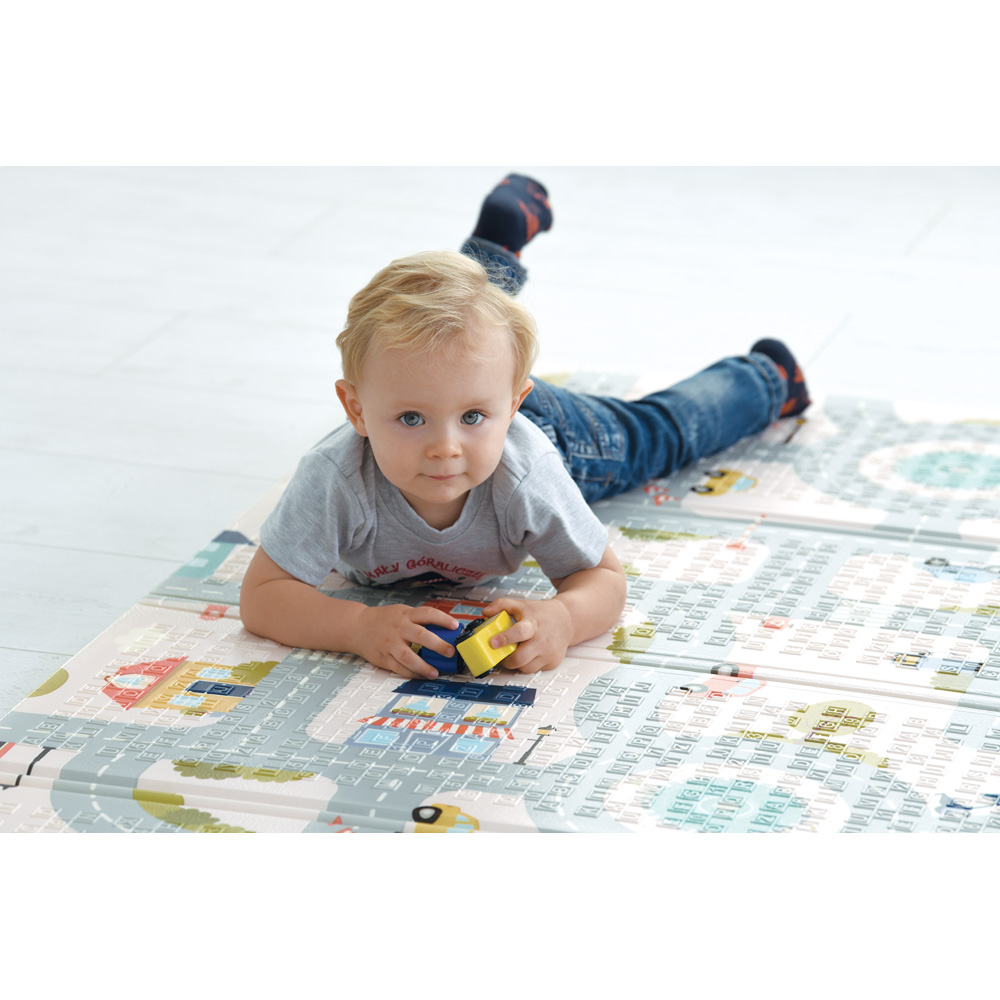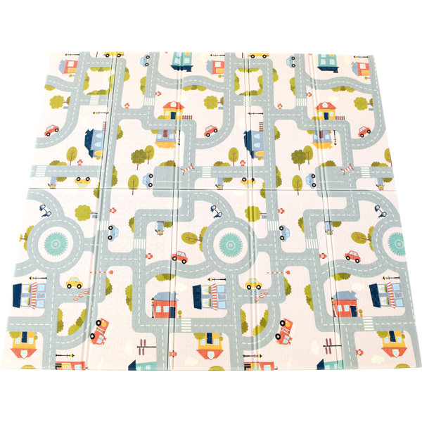 Auf der grossen Matte hat eine ganze Stadt Platz, in der es viel zu entdecken gibt. Auf dem Straßennetz mit Kreisverkehren und Zebrastreifen können sich die Kleinen auf Erkundungstour begeben. Die Matte aus XPE-Schaumstoff ist faltbar und leicht zu reinigen.