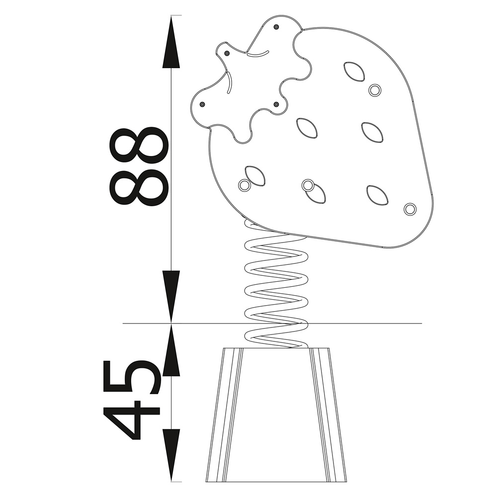 Kleines Früchtchen - grosser Wippspass! Die leuchtend rote Erdbeere begeistert alle Kinder. • Anzahl der Nutzer: 1 • Grundfläche: 69 x 46 cm • Sicherheitsbereich: 369 x 346 cm (Fläche: 10,8 m²) • Gesamthöhe: 88 cm • max. freie Fallhöhe: 60 cm • Sitzhöhe: 45 cm • von 1 bis 12 Jahren