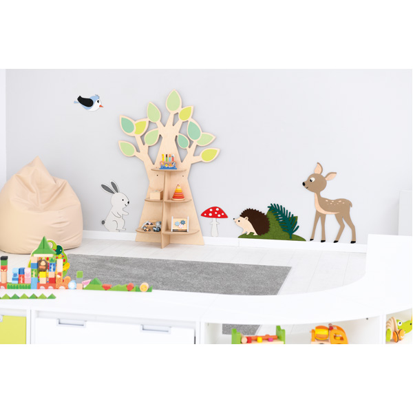 Diese bunten Wandapplikationen sind nicht nur ein Blickfang in jedem Raum. Dank dem Einsatz von Filzelementen verhelfen sie auch zu mehr Ruhe, weil störende Geräusche gedämpft werden. Sie können einzeln oder in thematischen Gruppen angebracht werden. Die farbigen Elemente bestehen aus diversen Materialien und haben unterschiedliche Oberflächen. Die Kinder können sie nicht nur betrachten, sondern auch befühlen, was die Wahrnehmung schult.