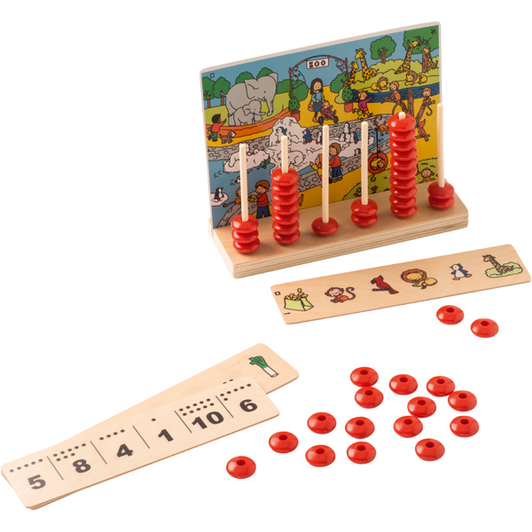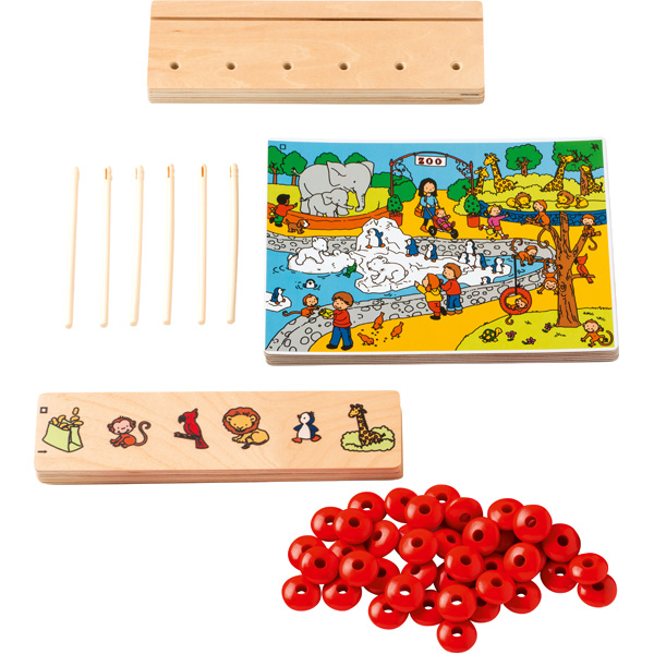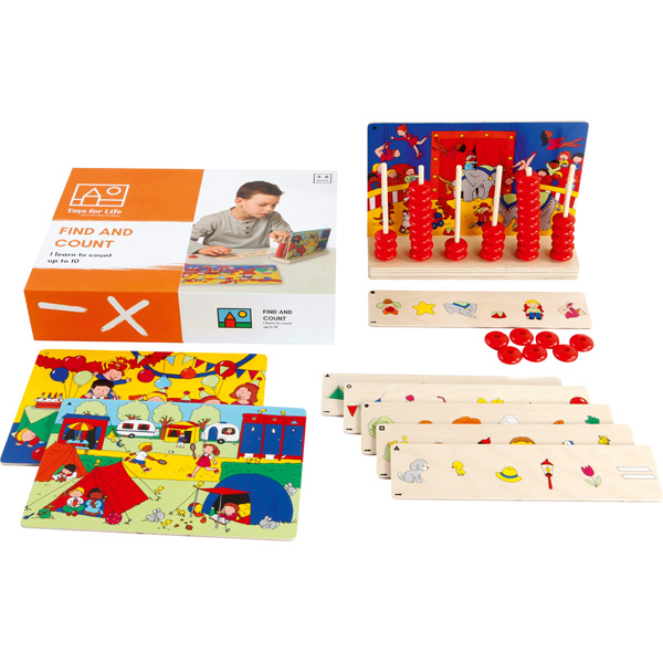 Auf jedem der 6 Bilder haben sich die Gegenstände von den Zuordnungskarten versteckt, manche auch mehrfach. Finde sie und stecke für jedes gefundene Element eine Perle auf den zugehörigen Stab. Auf der Rückseite der Zuordnungskarte findest du die richtige Lösung – sowohl als Punktmenge als auch als Zahl angezeigt. Fördert das Zählen und Erkennen der Zahlen bis 10.