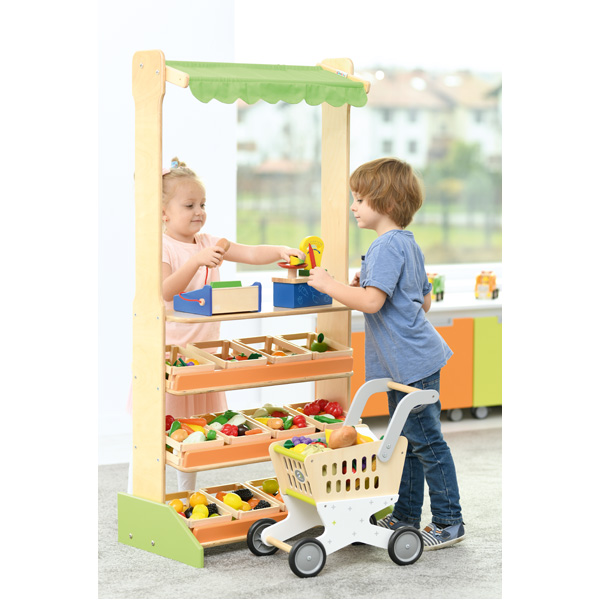 Bietet viel Platz für die wichtigsten Lebensmittel. Der handliche Griff und die gummierten Reifen machen das Hin- und Herschieben durchs Spielzimmer einfach und unkompliziert.