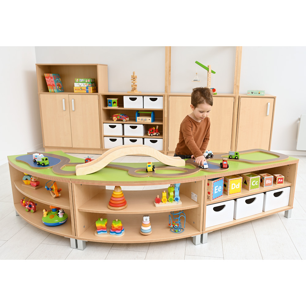Dreiteiliger Landschafts-Aufsatz mit Strasse, Seen und Brücke. 2 Teile sind gebogen und passen auf die Flexi Bogenschränke, der gerade Teil passt auf den Schrank B 89 (mit Ausnahme der Schränke mit Spiegel und Whiteboard-Rückwand) – beide Schränke sind in 2 Höhen erhältlich, auf Rollen oder Beinen.