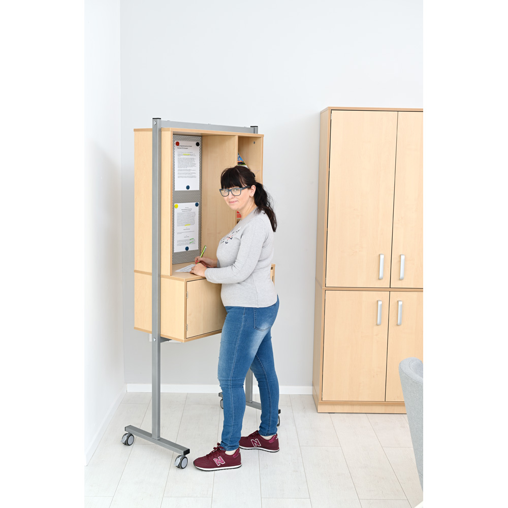 Mobiler Infostand, perfekt für den Eingangsbereich, Elternabende oder Konferenzen. Mit Info- bzw. Flyerauslage, Postfach mit Briefschlitz und Schrankfach, beide abschliessbar, sowie einer perforierten Metalltafel als Rückwand - hier können beidseitig Aushänge mit Magneten angebracht werden. Die Oberseite des Schrankteils kann zudem als Arbeitsfläche für kleine Schreibarbeiten genutzt werden.