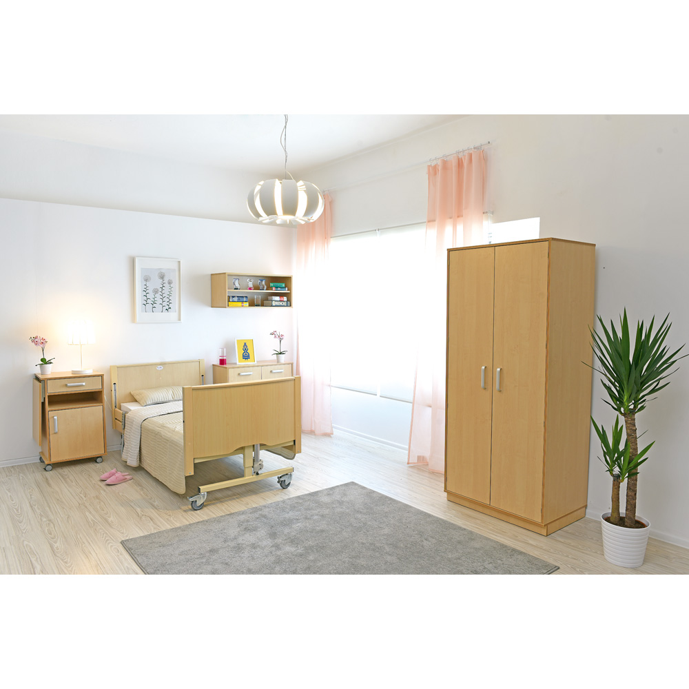 Der geräumige Kleiderschrank mit Trennwand verfügt auf der linken Seite über 4 Einlegeböden, der 1. und 4. Einlegeboden sind höhenverstellbar. Auf der rechten Seite befinden sich Kleiderstange und Ablagefach.