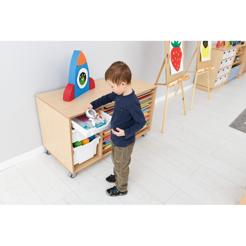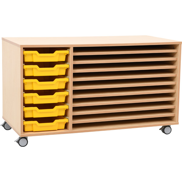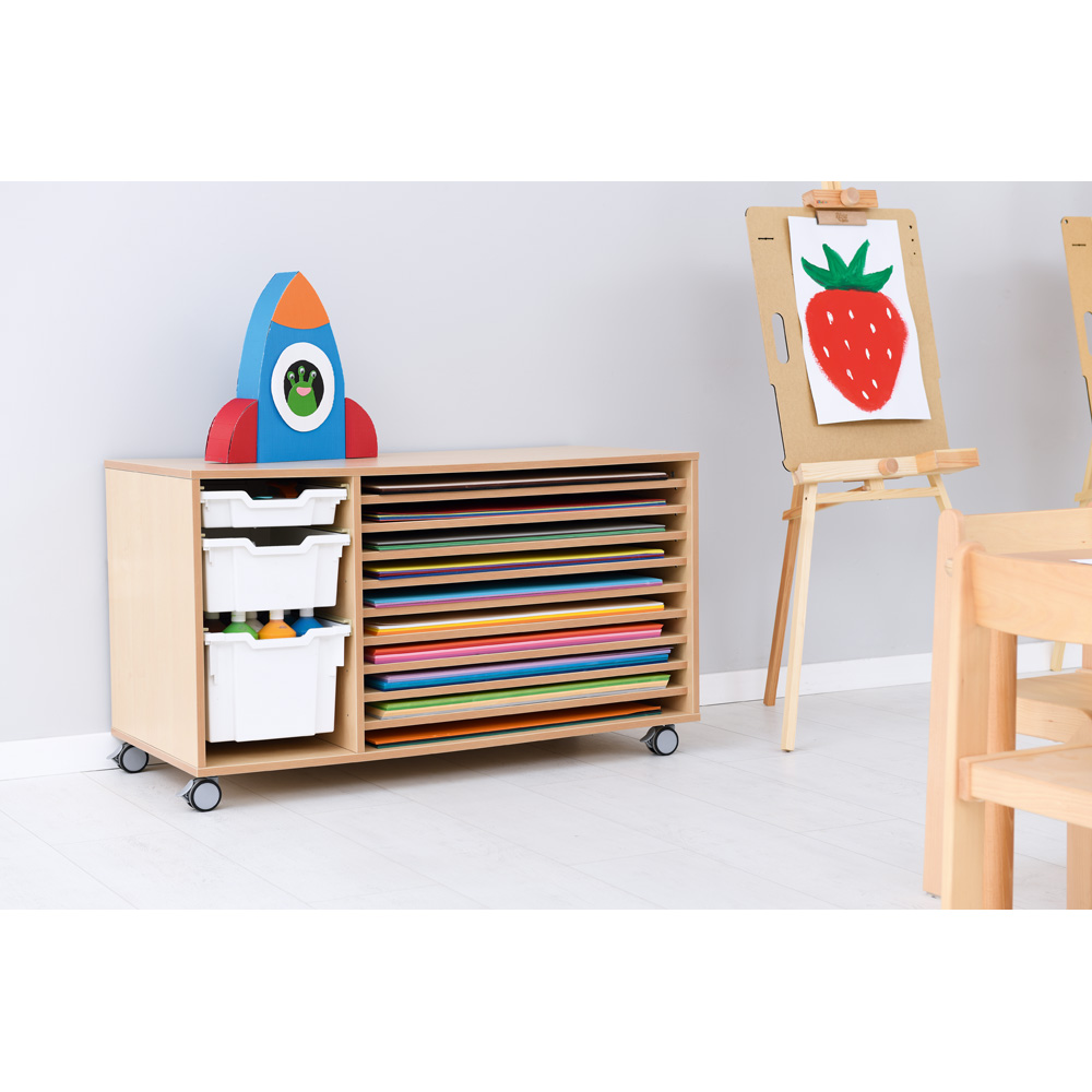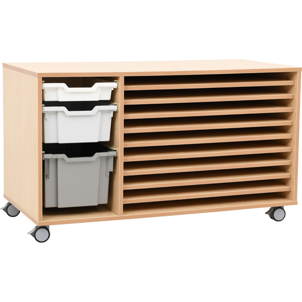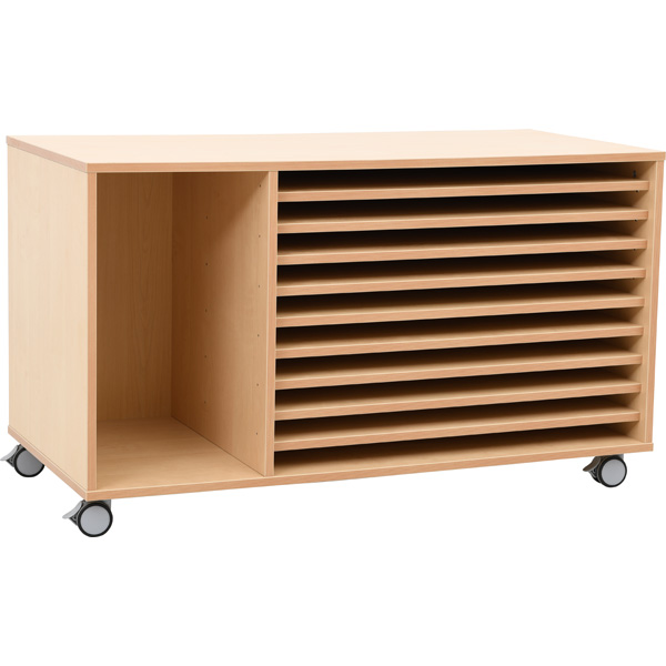 Mobiles Regal mit 10 Fächern; passend für Papier bis Format 50x70 cm (B2). Ins linke Fach passen bis zu 6 flache Kunststoffbehälter (372005-372026, 372034-372041 und 372050-372069, separat bestellbar).