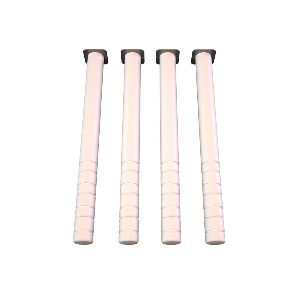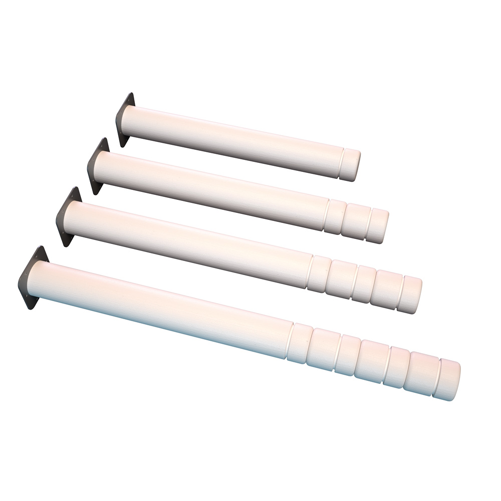 Die Befestigung erfolgt mit Metallringen, die eine hohe Stabilität und Haltbarkeit garantieren. Höhenverstellung durch Befestigung von Aufsätzen aus Holz. Angegebene Höhen sind die Tischhöhen (TH). Montageringe und Schrauben werden mit der jeweiligen Flexi Tischplatte geliefert.