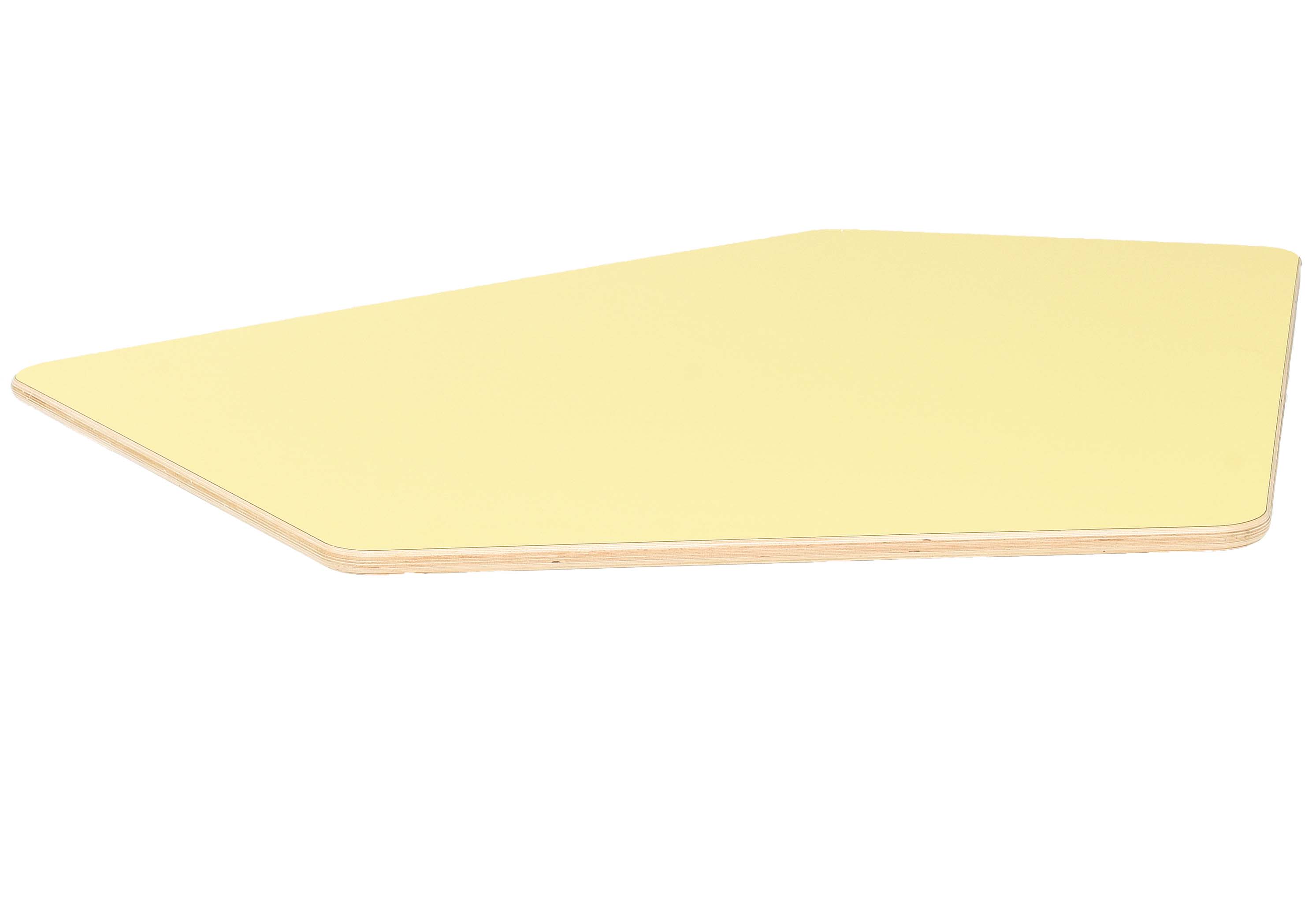 Solide und formschöne Echtholztischplatte aus farbigem HPL-beschichtetem Sperrholz (Stärke: 25 mm); Kanten und Ecken abgerundet, geschliffen und versiegelt mit umweltschonendem Acryllack auf Wasserbasis. Die fünfeckige Tischform bietet viele interessante Einsatzmöglichkeiten.