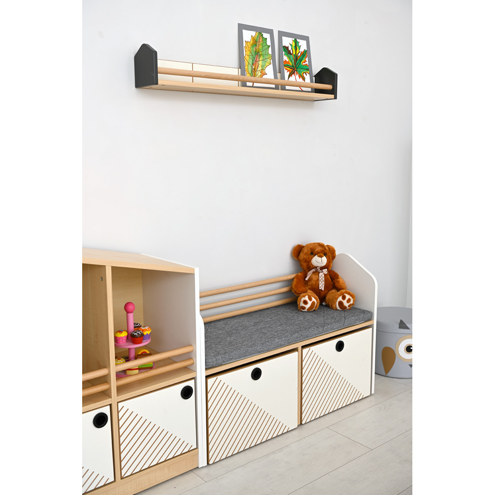 Kollektion FLO - Aussergewöhnliche Kindermöbel mit interessanten Formen, einem modernen Design und durchdachten Funktionen bieten den Räumen individuelle Gestaltungsmöglichkeiten. Die Kombination aus hellem Ahorn-Dekor mit weisser und anthrazitfarbener Oberfläche gibt den Innenräumen ein modernes Aussehen. Charakteristisch für diese Serie sind die schräg nach oben verlaufenden Oberplatten der Schränke, die dem Ganzen eine ausdrucksstarke Form verleihen. Die Kombination zweier Schränke mit rechtem und linkem „Giebel” ergibt die Form eines Hauses. Die Anordnung der Schränke im System Links-Links oder Rechts-Rechts verwandelt die Schränke auf magische Weise in eine Bergkette. Die nicht standardisierte Form der Schränke ermöglicht eine Vielzahl an Kombinationsmöglichkeiten. Ergänzt werden die Schränke durch besondere Details, z.B. Grifflöcher, die als runde schwarze Aussparungen eingearbeitet sind, Fräsungen in den Türen und Schubladen sowie runde Löcher in den Rückenlehnen von Stühlen.