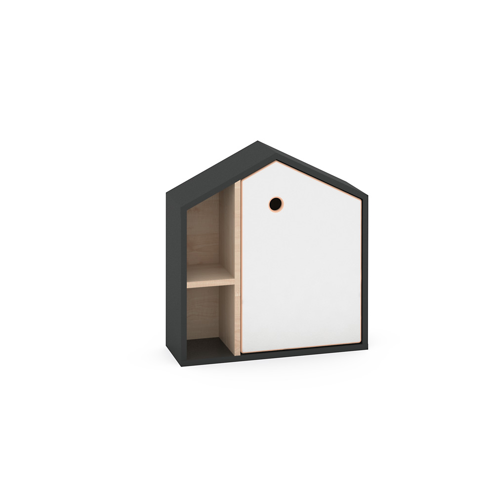 In Hausform, mit offenen Fächern und einer Tür mit Griffloch.