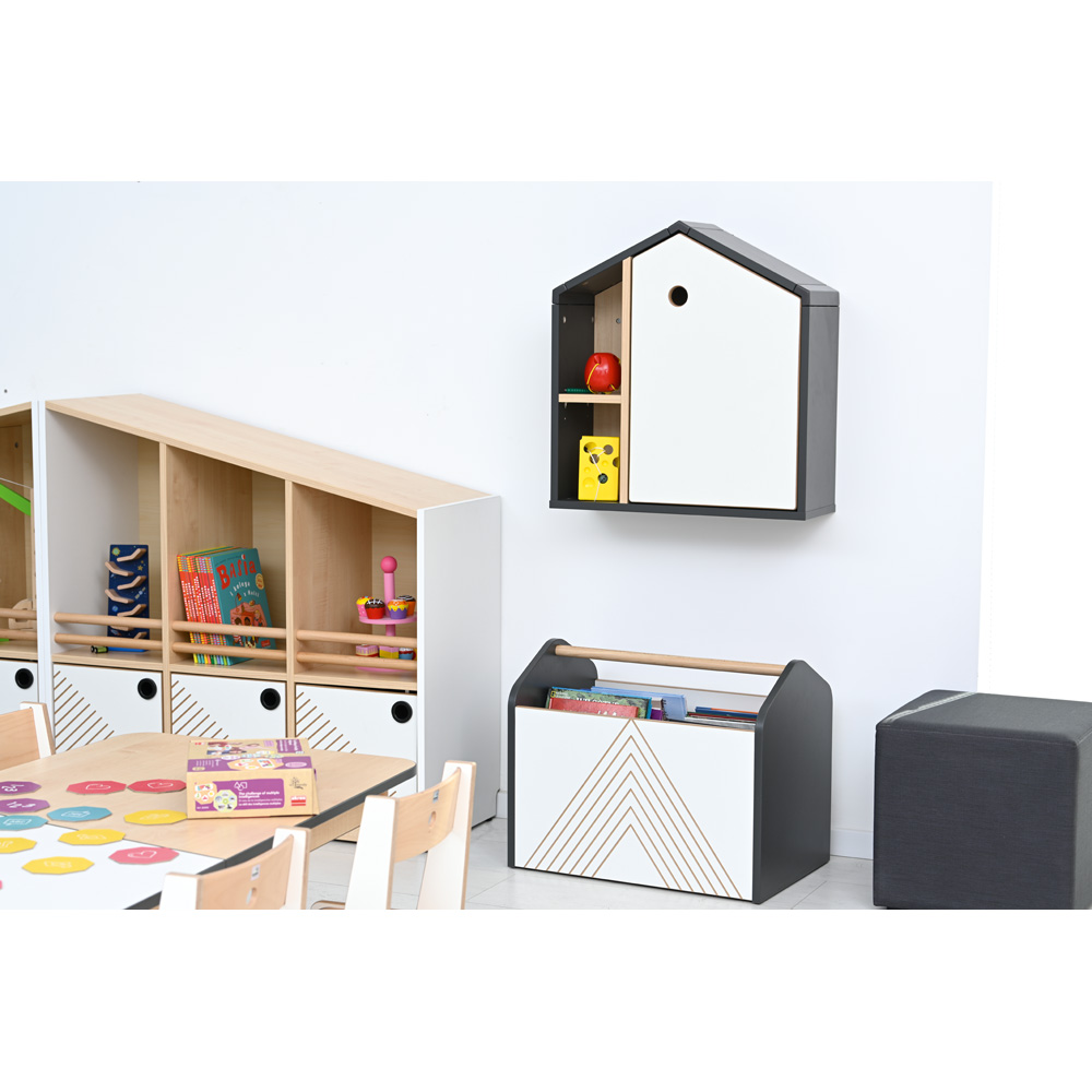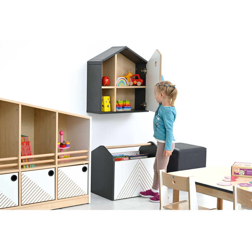 Kollektion FLO - Aussergewöhnliche Kindermöbel mit interessanten Formen, einem modernen Design und durchdachten Funktionen bieten den Räumen individuelle Gestaltungsmöglichkeiten. Die Kombination aus hellem Ahorn-Dekor mit weisser und anthrazitfarbener Oberfläche gibt den Innenräumen ein modernes Aussehen. Charakteristisch für diese Serie sind die schräg nach oben verlaufenden Oberplatten der Schränke, die dem Ganzen eine ausdrucksstarke Form verleihen. Die Kombination zweier Schränke mit rechtem und linkem „Giebel” ergibt die Form eines Hauses. Die Anordnung der Schränke im System Links-Links oder Rechts-Rechts verwandelt die Schränke auf magische Weise in eine Bergkette. Die nicht standardisierte Form der Schränke ermöglicht eine Vielzahl an Kombinationsmöglichkeiten. Ergänzt werden die Schränke durch besondere Details, z.B. Grifflöcher, die als runde schwarze Aussparungen eingearbeitet sind, Fräsungen in den Türen und Schubladen sowie runde Löcher in den Rückenlehnen von Stühlen.