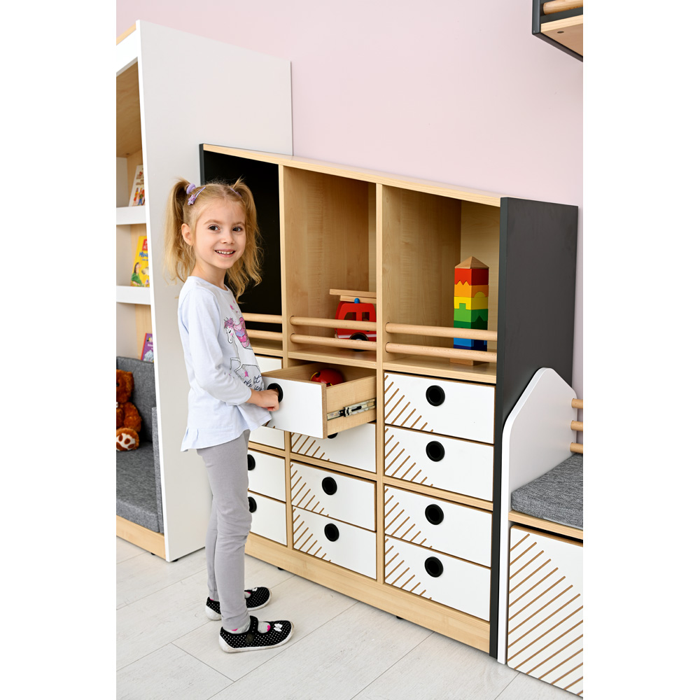 Kollektion FLO - Aussergewöhnliche Kindermöbel mit interessanten Formen, einem modernen Design und durchdachten Funktionen bieten den Räumen individuelle Gestaltungsmöglichkeiten. Die Kombination aus hellem Ahorn-Dekor mit weisser und anthrazitfarbener Oberfläche gibt den Innenräumen ein modernes Aussehen. Charakteristisch für diese Serie sind die schräg nach oben verlaufenden Oberplatten der Schränke, die dem Ganzen eine ausdrucksstarke Form verleihen. Die Kombination zweier Schränke mit rechtem und linkem „Giebel” ergibt die Form eines Hauses. Die Anordnung der Schränke im System Links-Links oder Rechts-Rechts verwandelt die Schränke auf magische Weise in eine Bergkette. Die nicht standardisierte Form der Schränke ermöglicht eine Vielzahl an Kombinationsmöglichkeiten. Ergänzt werden die Schränke durch besondere Details, z.B. Grifflöcher, die als runde schwarze Aussparungen eingearbeitet sind, Fräsungen in den Türen und Schubladen sowie runde Löcher in den Rückenlehnen von Stühlen.