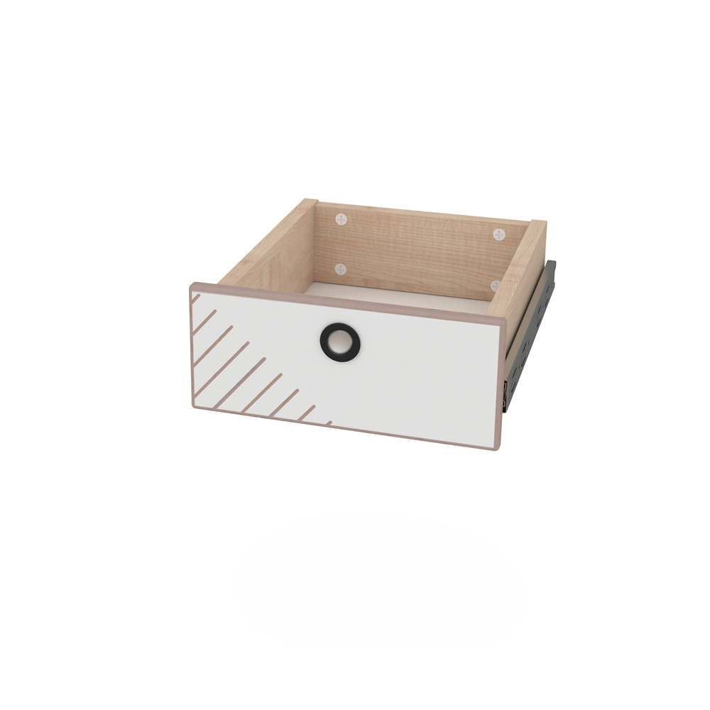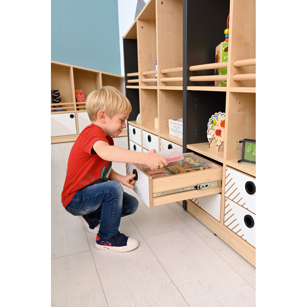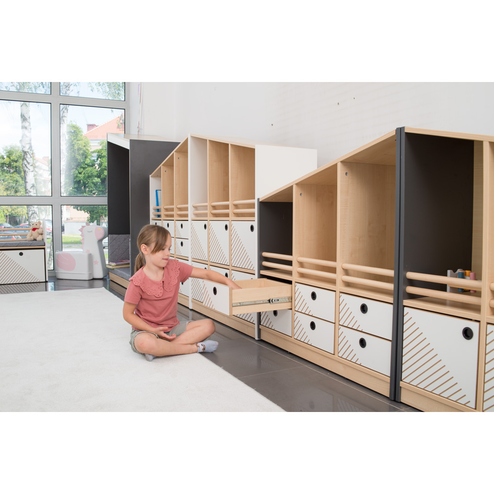 Kollektion FLO - Aussergewöhnliche Kindermöbel mit interessanten Formen, einem modernen Design und durchdachten Funktionen bieten den Räumen individuelle Gestaltungsmöglichkeiten. Die Kombination aus hellem Ahorn-Dekor mit weisser und anthrazitfarbener Oberfläche gibt den Innenräumen ein modernes Aussehen. Charakteristisch für diese Serie sind die schräg nach oben verlaufenden Oberplatten der Schränke, die dem Ganzen eine ausdrucksstarke Form verleihen. Die Kombination zweier Schränke mit rechtem und linkem „Giebel” ergibt die Form eines Hauses. Die Anordnung der Schränke im System Links-Links oder Rechts-Rechts verwandelt die Schränke auf magische Weise in eine Bergkette. Die nicht standardisierte Form der Schränke ermöglicht eine Vielzahl an Kombinationsmöglichkeiten. Ergänzt werden die Schränke durch besondere Details, z.B. Grifflöcher, die als runde schwarze Aussparungen eingearbeitet sind, Fräsungen in den Türen und Schubladen sowie runde Löcher in den Rückenlehnen von Stühlen.