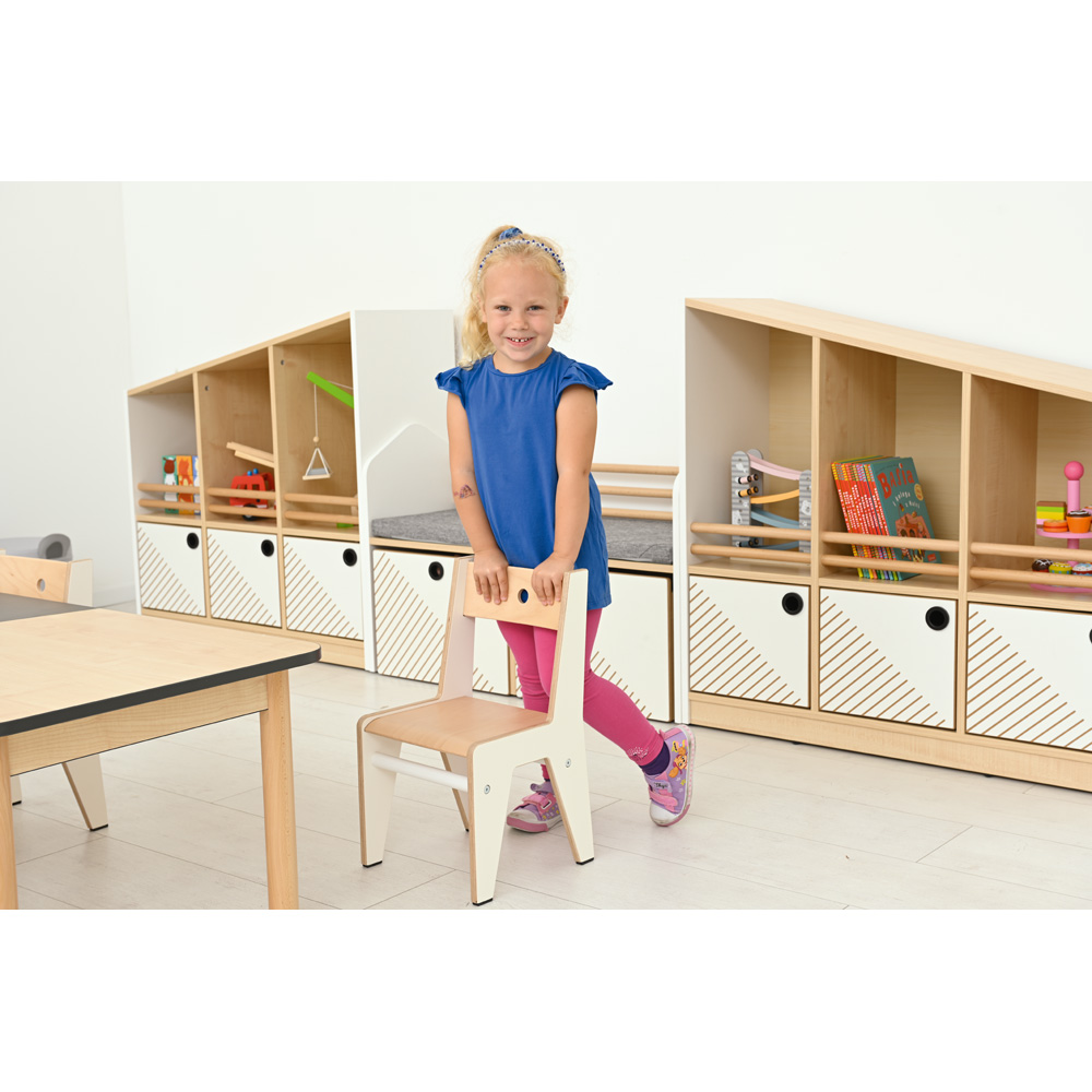 Stabile Kinderstühle mit Gestell aus laminiertem wasserabweisendem Sperrholz (weiss oder schwarz), Sitzfläche und Rückenlehne aus lackiertem Birke-Sperrholz.