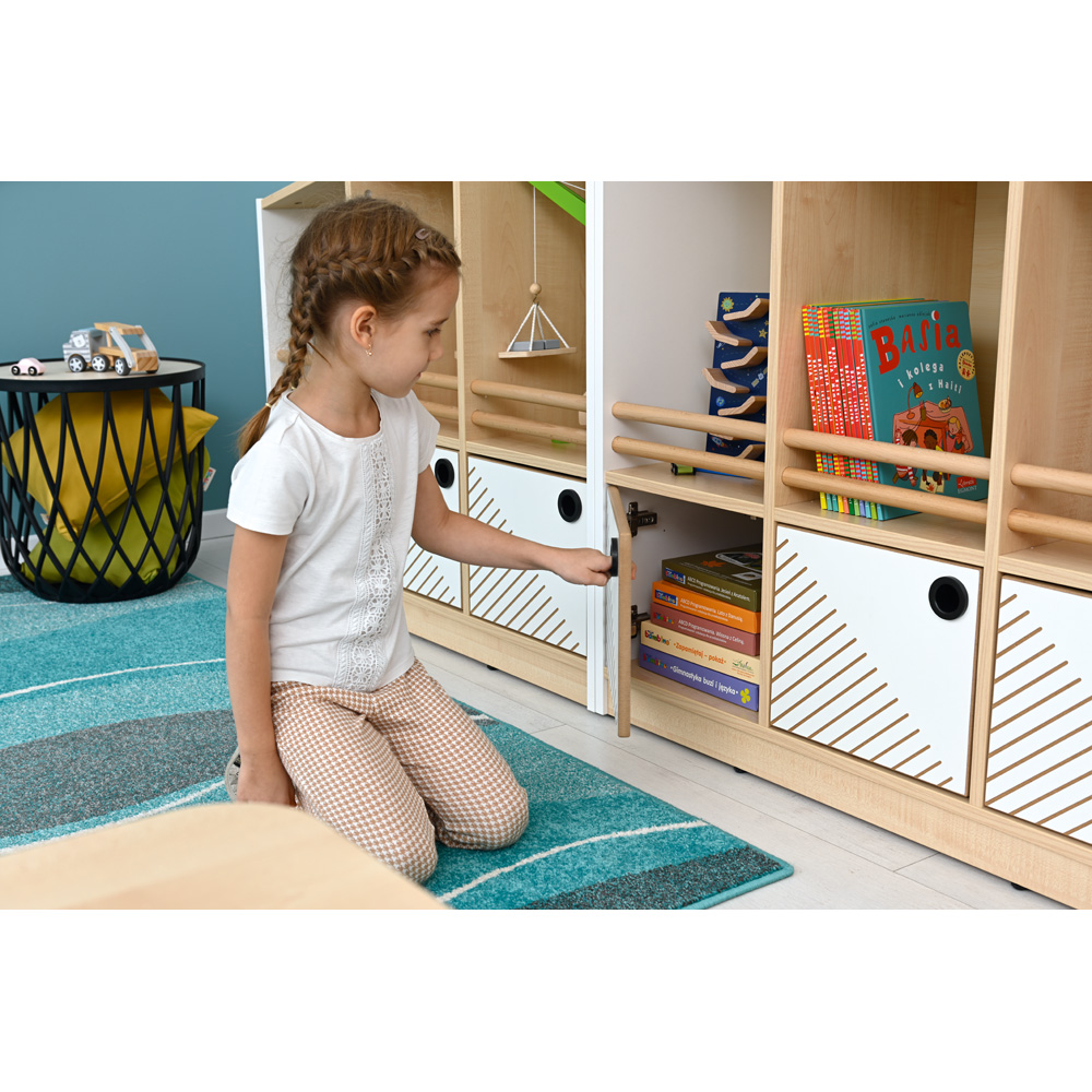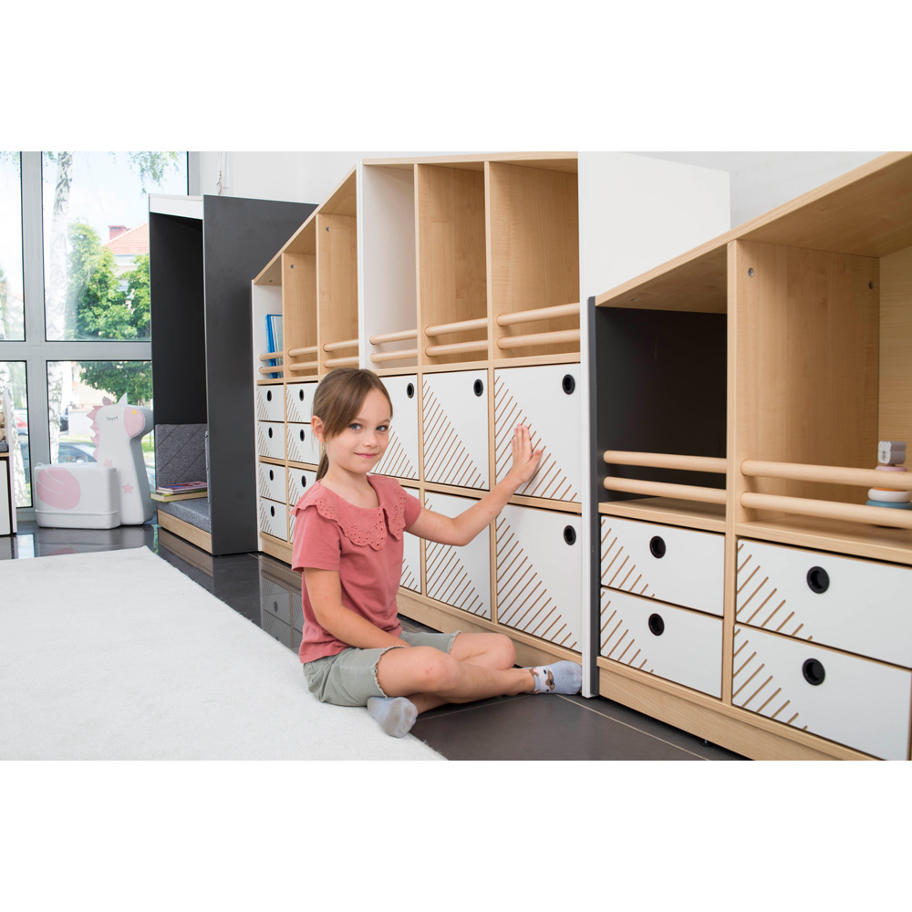 Kollektion FLO - Aussergewöhnliche Kindermöbel mit interessanten Formen, einem modernen Design und durchdachten Funktionen bieten den Räumen individuelle Gestaltungsmöglichkeiten. Die Kombination aus hellem Ahorn-Dekor mit weisser und anthrazitfarbener Oberfläche gibt den Innenräumen ein modernes Aussehen. Charakteristisch für diese Serie sind die schräg nach oben verlaufenden Oberplatten der Schränke, die dem Ganzen eine ausdrucksstarke Form verleihen. Die Kombination zweier Schränke mit rechtem und linkem „Giebel” ergibt die Form eines Hauses. Die Anordnung der Schränke im System Links-Links oder Rechts-Rechts verwandelt die Schränke auf magische Weise in eine Bergkette. Die nicht standardisierte Form der Schränke ermöglicht eine Vielzahl an Kombinationsmöglichkeiten. Ergänzt werden die Schränke durch besondere Details, z.B. Grifflöcher, die als runde schwarze Aussparungen eingearbeitet sind, Fräsungen in den Türen und Schubladen sowie runde Löcher in den Rückenlehnen von Stühlen.