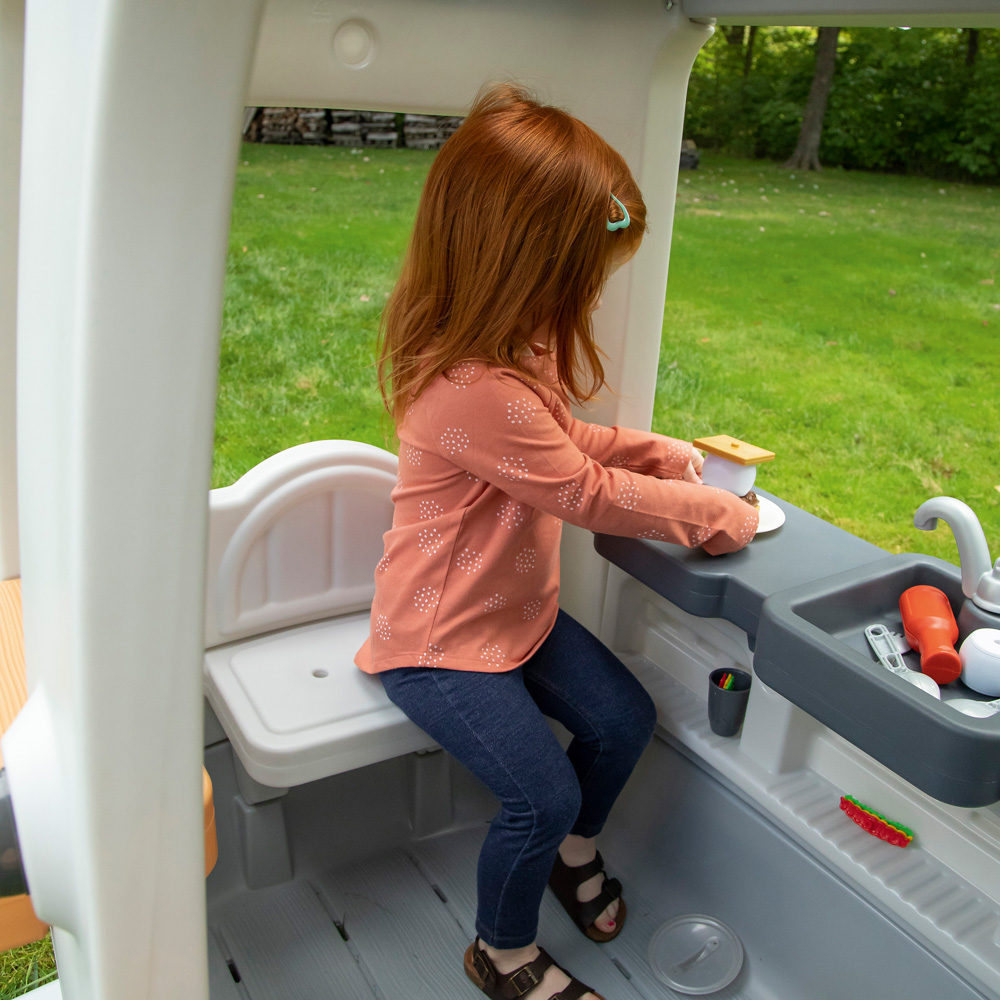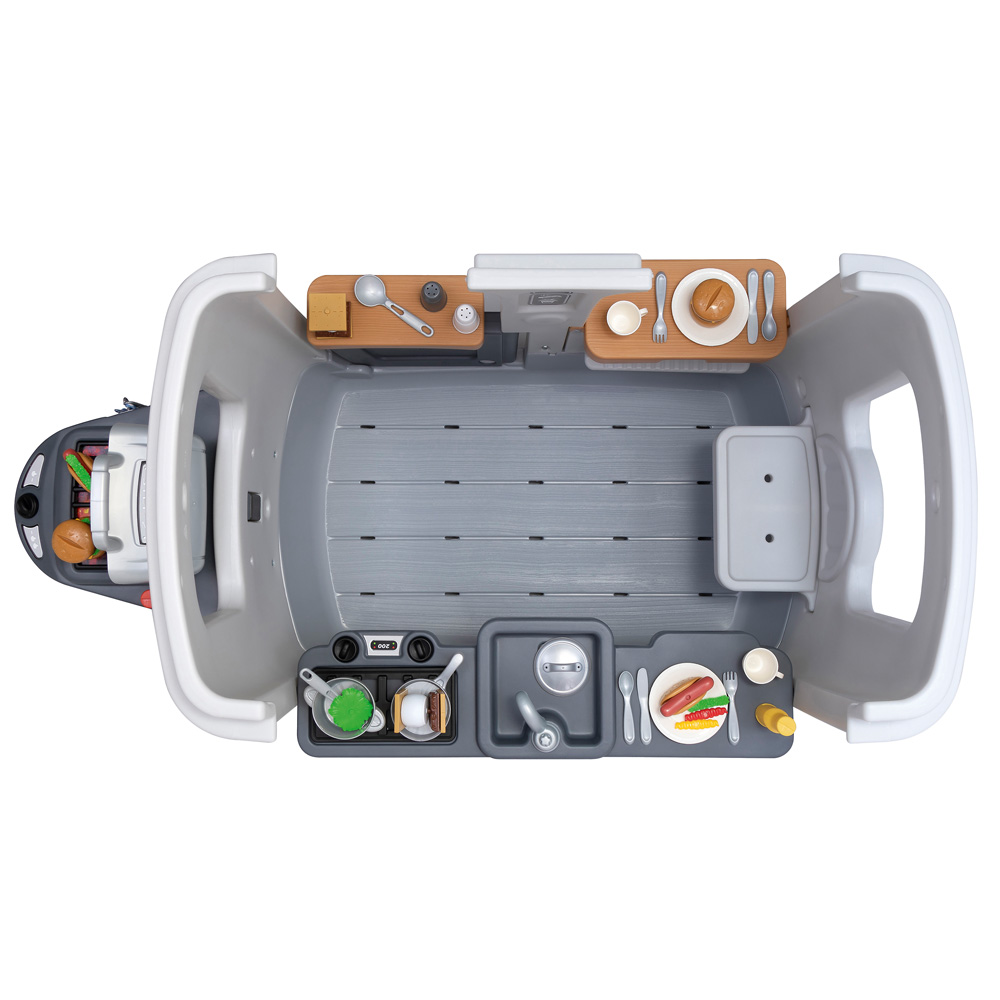 Der Food Truck Camper ist vollgepackt mit spannenden Spielanregungen, die perfekt die soziale Entwicklung, Rollenspiele und Selbstdarstellung fördern. Der offene Wohnwagen verfügt über grosse Fenster und eine geteilte Tür, sodass Betreuer die Kinder beim Spielen im Auge behalten können.