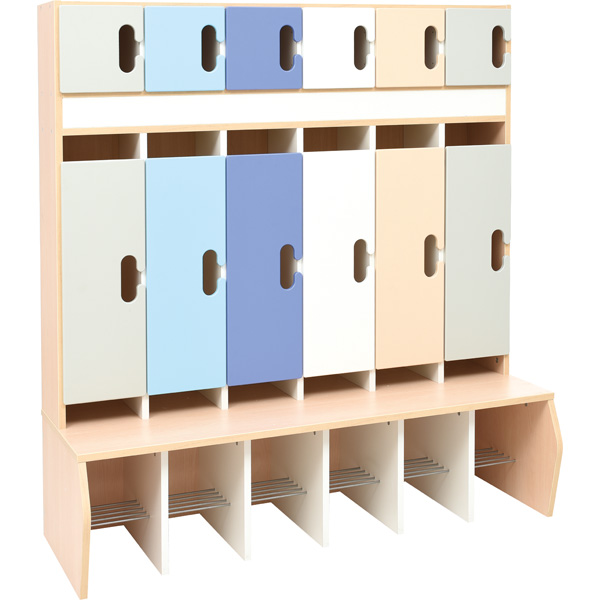 Die Garderoben sind schmal, ähnlich einem Spind, mit 3 oder 6 Sitzplätzen; aus laminierter Spanplatte (Stärke 18 mm) in weiss oder Ahorn-Optik, Zwischenwände immer weiss. Farbige Türen inklusive. Im oberen Bereich befinden sich ein kleines Fach und eine Querleiste zum Anbringen von Namens- oder Symbolschildern. Die grossen Fächer in der Mitte verfügen über einen Doppelhaken für Bekleidung, das Unterteil dient als Schuhablage mit Gitterrost.