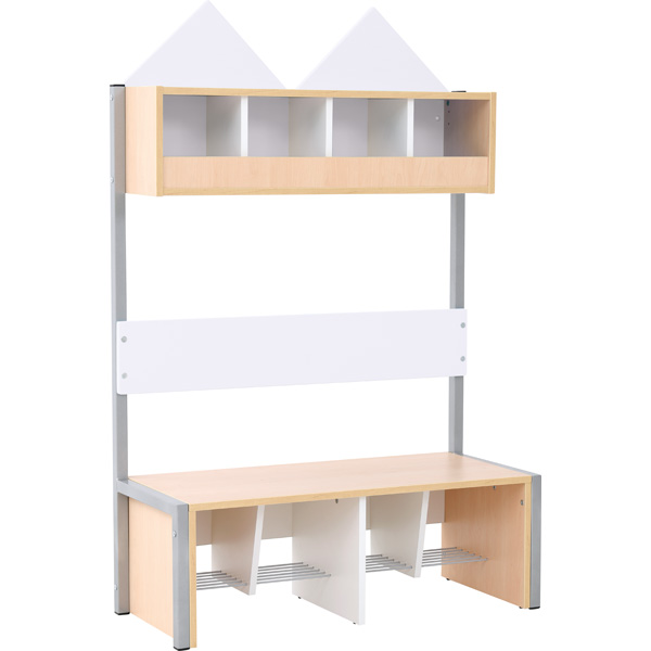 Fantasievolle Garderobe für 2 Kinder. Aus laminierter Spanplatte (Stärke 18 mm), wahlweise in Ahorn-Dekor oder weiss; Trennwände stets weiss; mit stabilem Metallgestell und praktischer Schuhablage mit Gitterrost. Die Rückwand des Regals ist als Giebelwand gestaltet und in verschiedenen Farben erhältlich (Material: farbig folierte MDF-Platte, Stärke 18 mm); Rückenlehne im gleichen Farbton. Farbige Haken (092530-092533, 255100-255102) separat erhältlich.