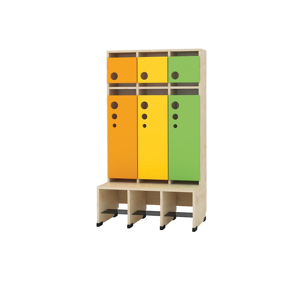 Hochwertige Kindergartengarderobe, wahlweise in hellem Ahorn-Dekor oder weiss. Die Sitzbank erstreckt sich über die gesamte Schrankfläche und besitzt eine eingebaute Schuhablage mit Gitterrost. Passende farbige Türen mit leise schliessenden Scharnieren (gross 855533-855542 und klein 855523-855532) sind separat bestellbar. Vorbohrungen für Scharniere befinden sich rechtsseitig. Jedes Fach hat einen Doppelhaken für Bekleidung sowie Vorbohrungen für zusätzliche Dreifach-Haken (092530-092532, 255100-255102, separat bestellbar). Die Garderobe ist mit Kantenschutzfüssen mit Bodenausgleichschrauben ausgestattet. Hinten gibt es eine Aussparung für die Sockelleiste.