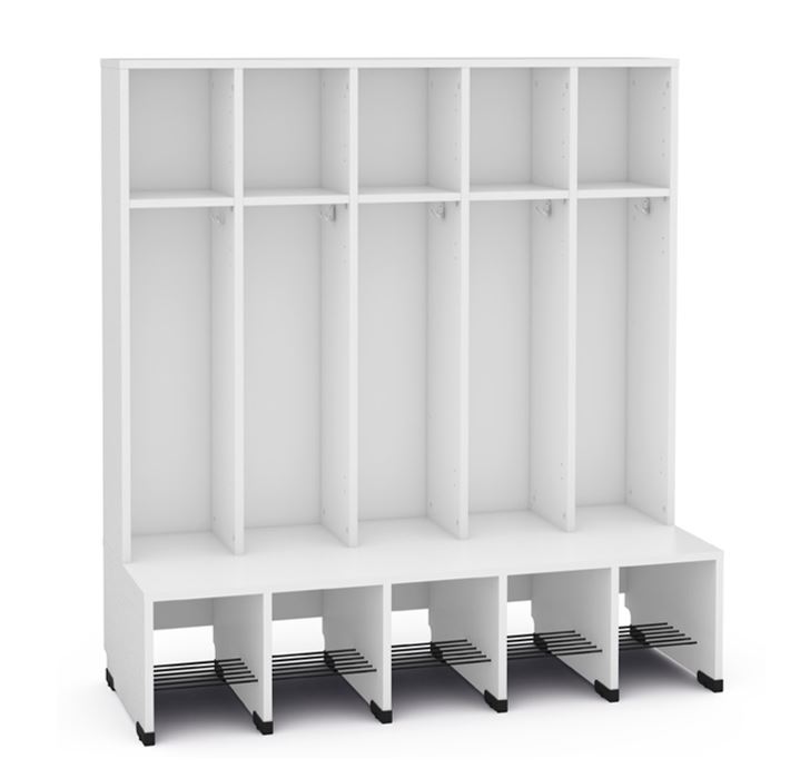 Hochwertige Kindergartengarderobe in hellem Ahorn-Dekor. Die Sitzbank erstreckt sich über die gesamte Schrankfläche und besitzt eine eingebaute Schuhablage mit Gitterrost. Passende farbige Türen mit leise schliessenden Scharnieren (gross 855533-855542 und klein 855523-855532) sind separat bestellbar. Vorbohrungen für Scharniere befinden sich rechtsseitig. Jedes Fach hat einen Doppelhaken für Bekleidung sowie Vorbohrungen für zusätzliche Dreifach-Haken (092530-092532, 255100-255102, separat bestellbar). Die Garderobe ist mit Kantenschutzfüssen mit Bodenausgleichschrauben ausgestattet. Hinten gibt es eine Aussparung für die Sockelleiste.