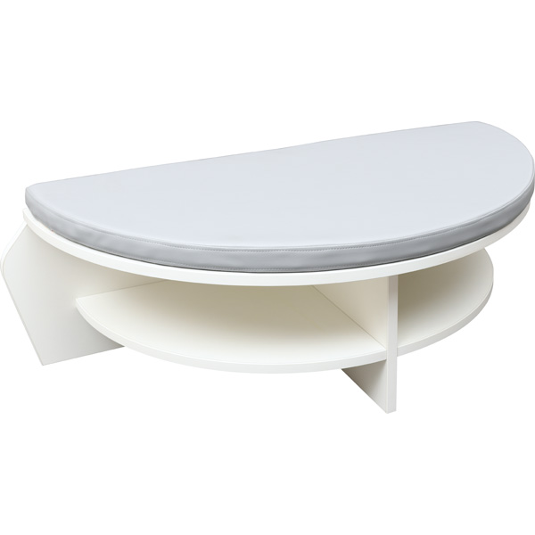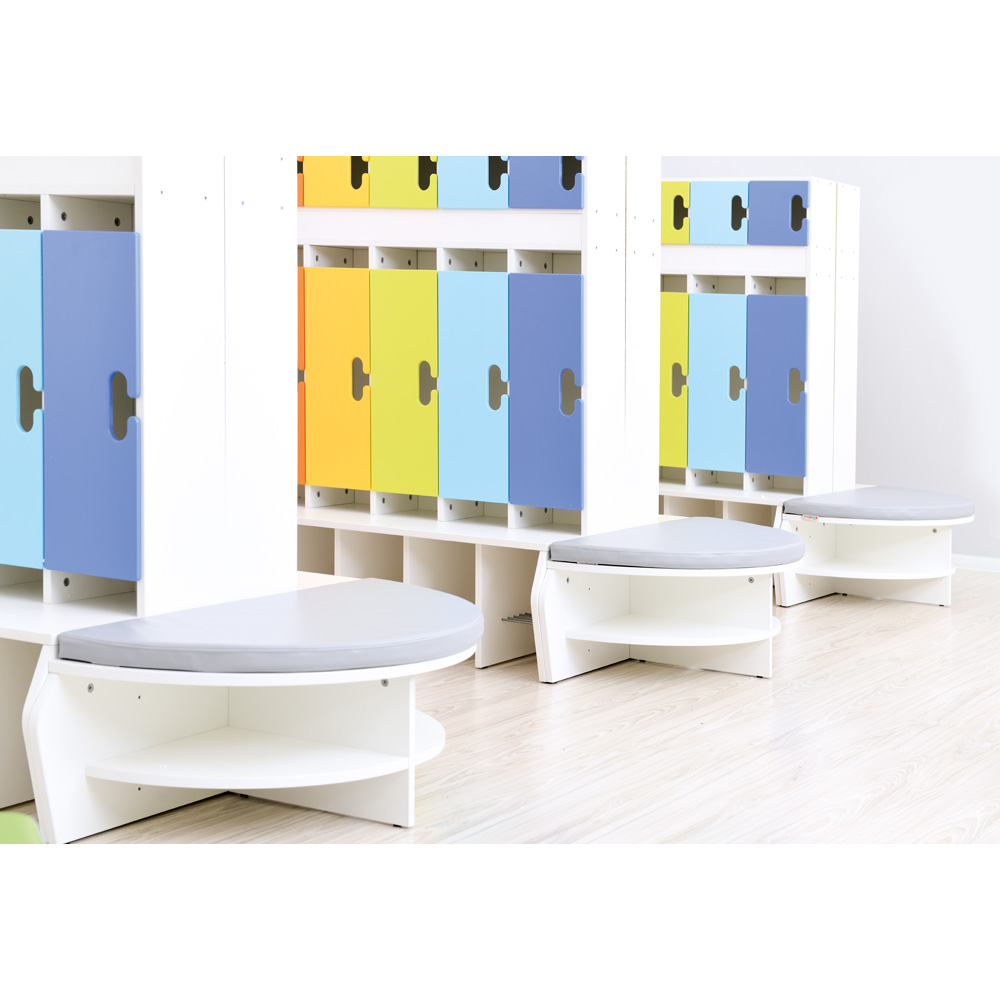 Die Garderoben sind schmal, ähnlich einem Spind, mit 3 oder 6 Sitzplätzen; aus laminierter Spanplatte (Stärke 18 mm) in weiss oder Ahorn-Optik, Zwischenwände immer weiss. Farbige Türen inklusive. Im oberen Bereich befinden sich ein kleines Fach und eine Querleiste zum Anbringen von Namens- oder Symbolschildern. Die grossen Fächer in der Mitte verfügen über einen Doppelhaken für Bekleidung, das Unterteil dient als Schuhablage mit Gitterrost.