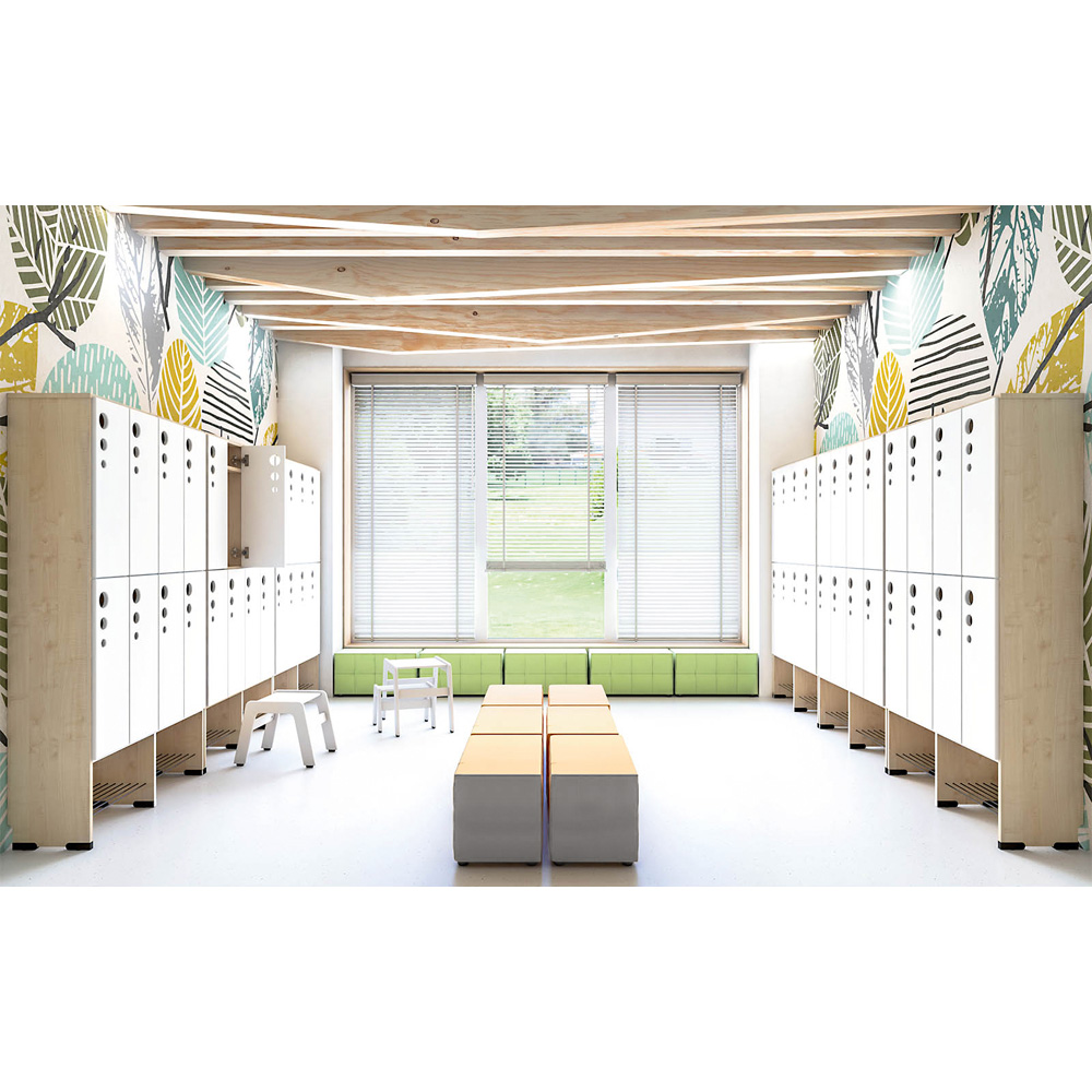 Die Garderobe mit fahrbarer Bank ist empfehlenswert für den Einsatz im Kindergarten.